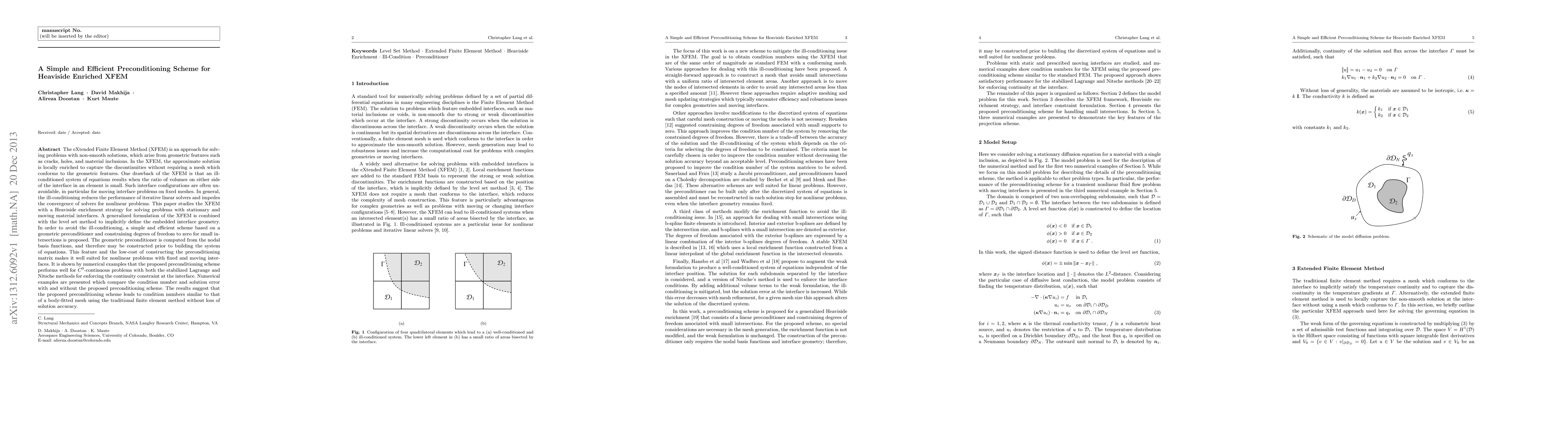 The eXtended Finite Element Method (XFEM) is an approach for solving problems with non-smooth solutions. In the XFEM, the approximate solution is locally enriched to capture discontinuities without requiring a mesh which conforms to the geometric features. One drawback of the XFEM is that an ill-conditioned system of equations results when the ratio of volumes on either side of the interface in an element is small. In this paper, to avoid this ill-conditioning, a simple and efficient scheme based on a geometric preconditioner and constraining degrees of freedom to zero for small intersections is proposed. This geometric preconditioner is computed from the nodal basis functions, and therefore may be constructed prior to building the system of equations. This feature and the low-cost of constructing the preconditioning matrix makes it well suited for nonlinear problems with fixed and moving interfaces.