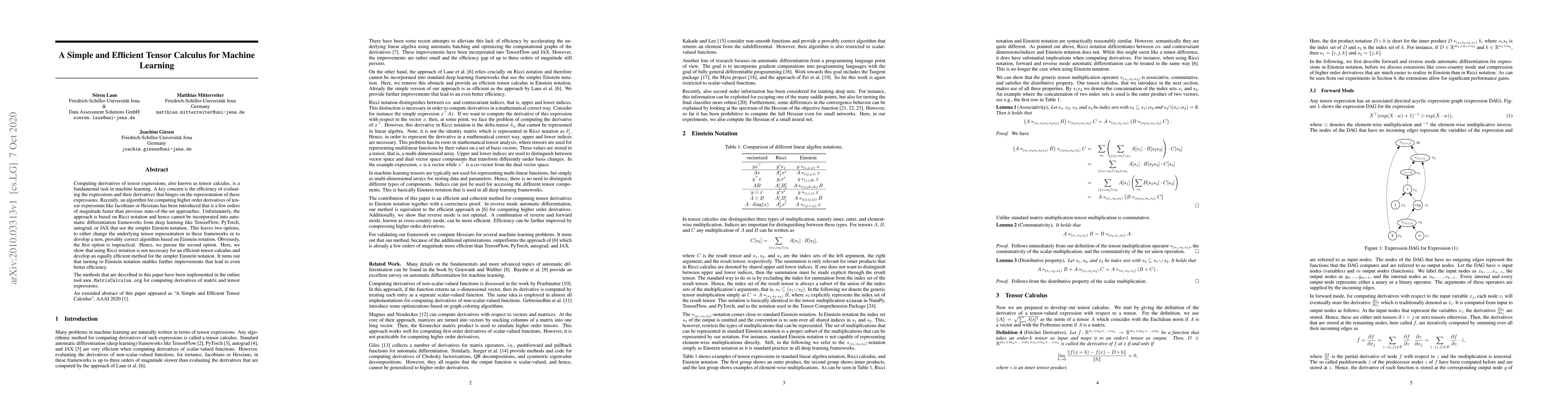 Computing derivatives of tensor expressions, also known as tensor calculus, is a fundamental task in machine learning. A key concern is the efficiency of evaluating the expressions and their derivatives that hinges on the representation of these expressions. Recently, an algorithm for computing higher order derivatives of tensor expressions like Jacobians or Hessians has been introduced that is a few orders of magnitude faster than previous state-of-the-art approaches. Unfortunately, the approach is based on Ricci notation and hence cannot be incorporated into automatic differentiation frameworks from deep learning like TensorFlow, PyTorch, autograd, or JAX that use the simpler Einstein notation. This leaves two options, to either change the underlying tensor representation in these frameworks or to develop a new, provably correct algorithm based on Einstein notation. Obviously, the first option is impractical. Hence, we pursue the second option. Here, we show that using Ricci notation is not necessary for an efficient tensor calculus and develop an equally efficient method for the simpler Einstein notation. It turns out that turning to Einstein notation enables further improvements that lead to even better efficiency. The methods that are described in this paper have been implemented in the online tool www.MatrixCalculus.org for computing derivatives of matrix and tensor expressions. An extended abstract of this paper appeared as "A Simple and Efficient Tensor Calculus", AAAI 2020.