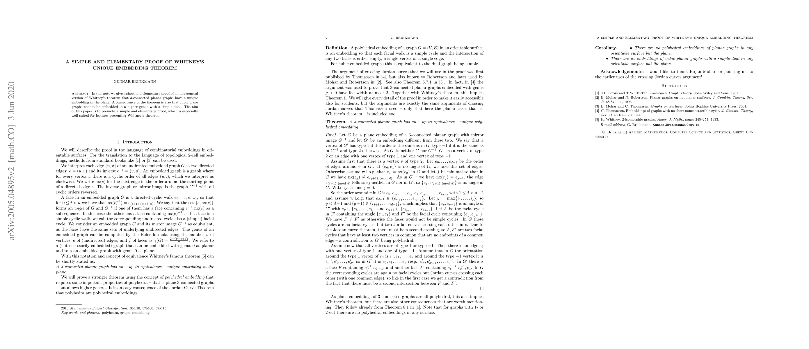 This paper presents a straightforward proof of Whitney's unique embedding theorem for 3-connected planar graphs, emphasizing simplicity for educational purposes, and demonstrates that cubic plane graphs cannot be embedded in higher genus with a simple dual.