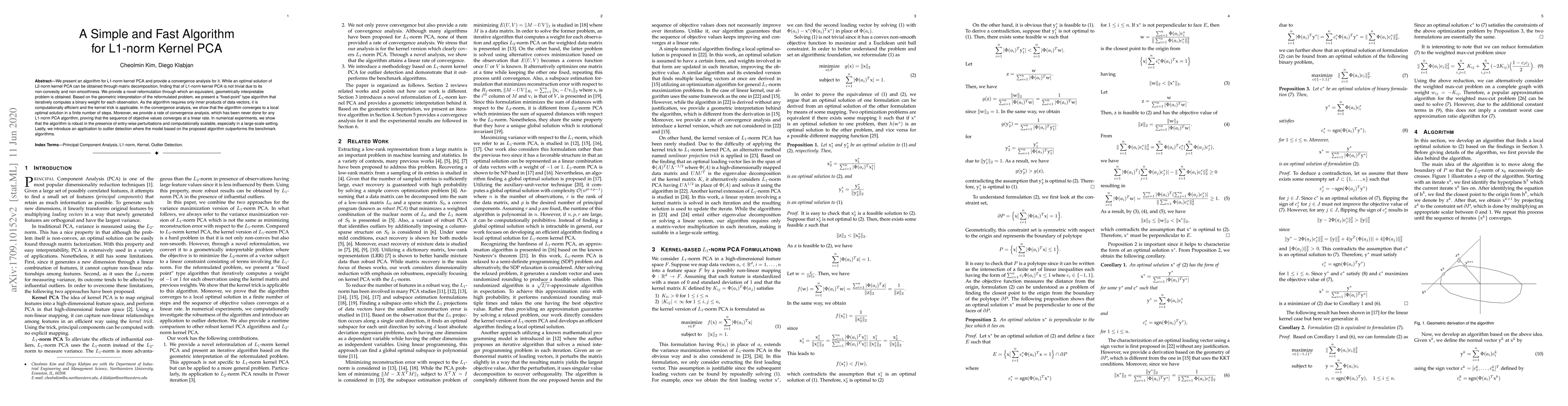 This paper introduces a computationally efficient algorithm for L1-norm kernel PCA, addressing the non-convexity and non-smoothness of the problem through a novel reformulation. The proposed fixed-point algorithm converges to a local optimal solution in a finite number of steps, demonstrating robustness and scalability in large-scale settings, and showing superior performance in outlier detection.