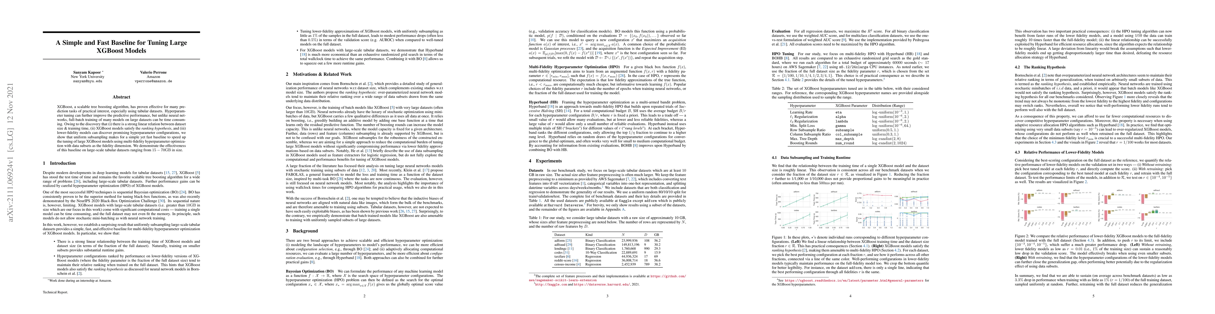 XGBoost, a scalable tree boosting algorithm, has proven effective for many prediction tasks of practical interest, especially using tabular datasets. Hyperparameter tuning can further improve the predictive performance, but unlike neural networks, full-batch training of many models on large datasets can be time consuming. Owing to the discovery that (i) there is a strong linear relation between dataset size & training time, (ii) XGBoost models satisfy the ranking hypothesis, and (iii) lower-fidelity models can discover promising hyperparameter configurations, we show that uniform subsampling makes for a simple yet fast baseline to speed up the tuning of large XGBoost models using multi-fidelity hyperparameter optimization with data subsets as the fidelity dimension. We demonstrate the effectiveness of this baseline on large-scale tabular datasets ranging from $15-70\mathrm{GB}$ in size.