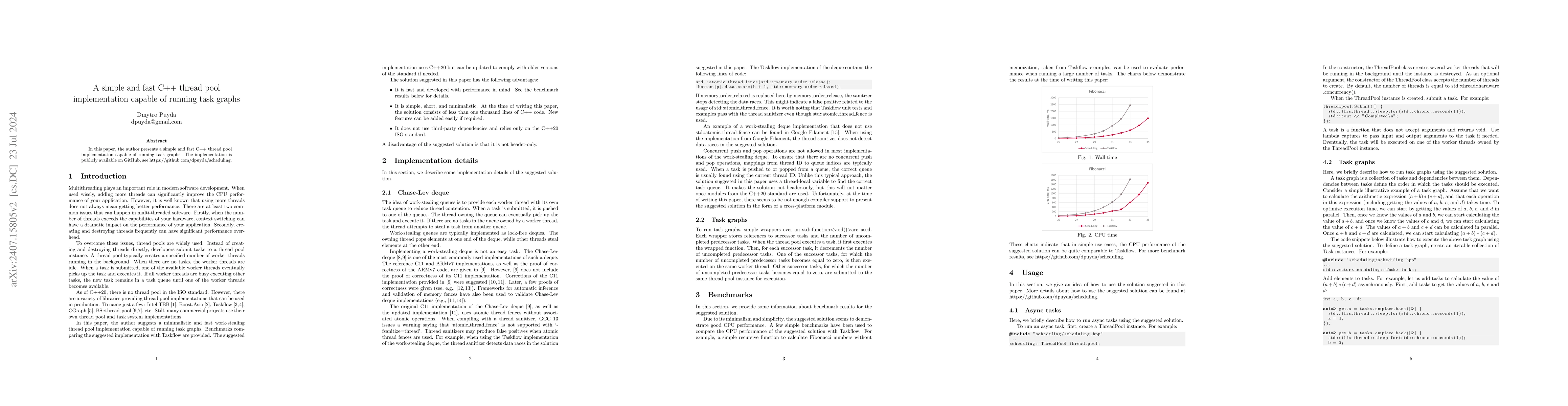 Summary: This paper introduces a straightforward and efficient C++ thread pool implementation designed for executing task graphs, with the code accessible on GitHub for public use.