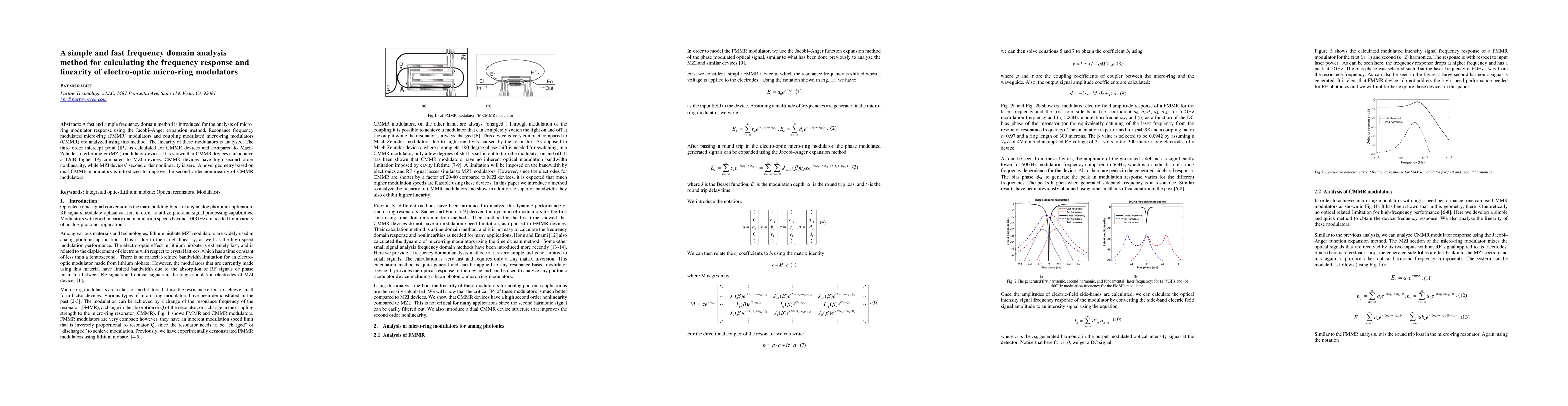 A fast and simple frequency domain method is introduced for the analysis of microring modulator response using the Jacobi Anger expansion method. Resonance frequency modulated microring (FMMR) modulators and coupling modulated microring modulators (CMMR) are analyzed using this method. The linearity of these modulators is analyzed. The third order intercept point (IP3) is calculated for CMMR devices and compared to Mach Zehnder interferometer (MZI) modulator devices. It is shown that CMMR devices can achieve a 12dB higher IP3 compared to MZI devices. CMMR devices have high second order nonlinearity, while MZI devices second order nonlinearity is zero. A novel geometry based on dual CMMR modulators is introduced to improve the second order nonlinearity of CMMR modulators.