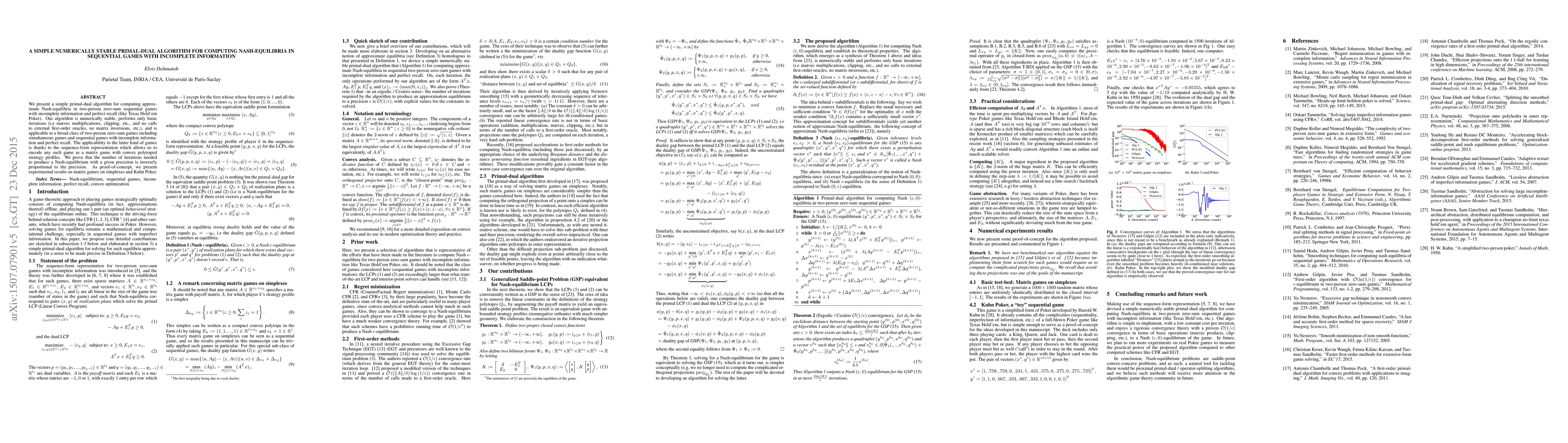 This paper proposes a numerically stable primal-dual algorithm for finding approximate Nash equilibria in two-person zero-sum sequential games with incomplete information, like Texas Hold'em Poker. The algorithm is simple, performs basic iterations, and is applicable to various game types, proving that its iteration count inversely correlates with desired precision.