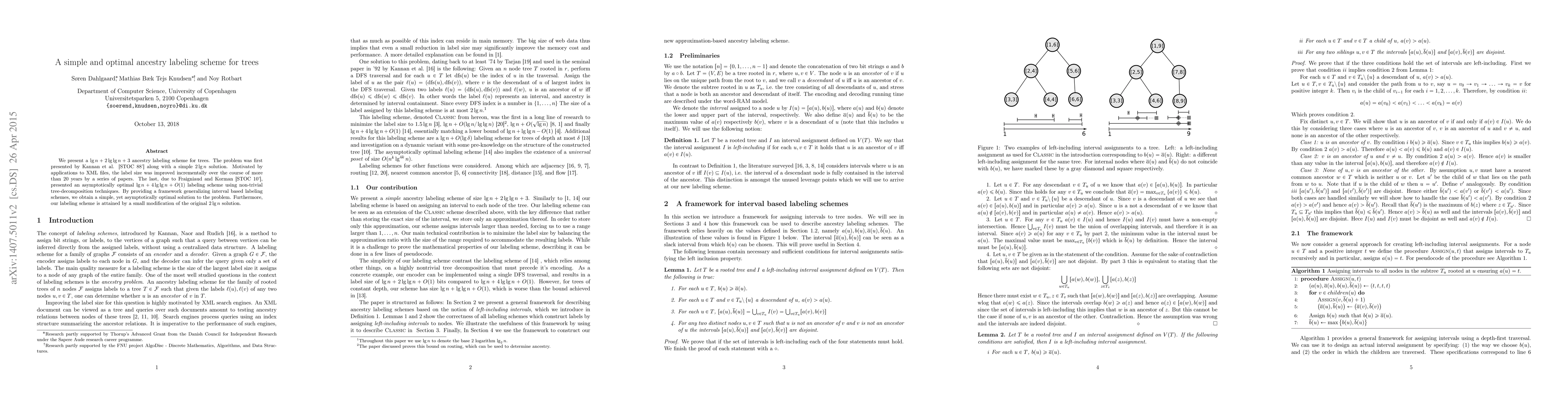 This paper introduces a simple and optimal ancestry labeling scheme for trees with a label size of $\lg n + 2 \lg \lg n + 3$, improving the previous best solution of $\lg n + 4 \lg \lg n + O(1)$ by using a generalized interval-based labeling framework. The new scheme is a small modification from the simpler $2 \lg n$ solution.