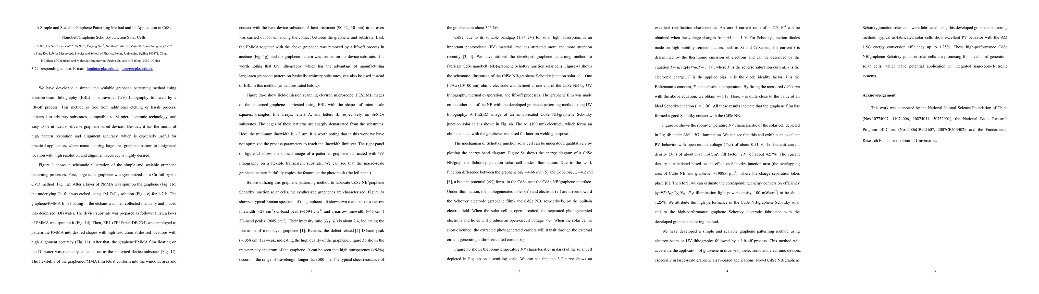 This paper presents a scalable graphene patterning method using lithography and lift-off, which enables high resolution and alignment without harsh processes. The method is applied to fabricate CdSe nanobelt/graphene Schottky junction solar cells, achieving an energy conversion efficiency of ~1.25%, indicating potential for integrated nano-optoelectronic systems.