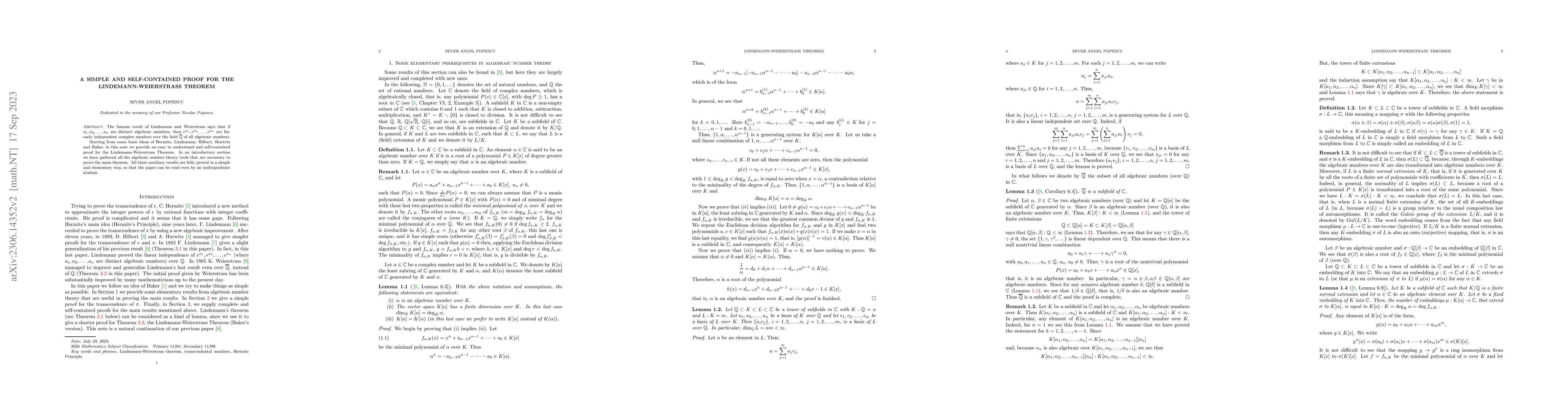 This paper presents a straightforward and self-contained proof of the Lindemann-Weierstrass theorem, demonstrating that exponentials of distinct algebraic numbers are linearly independent over the field of algebraic numbers. The proof utilizes foundational ideas from Hermite, Lindemann, Hilbert, Hurwitz, and Baker, with all necessary algebraic number theory tools clearly explained and fully proved for accessibility to undergraduate students.