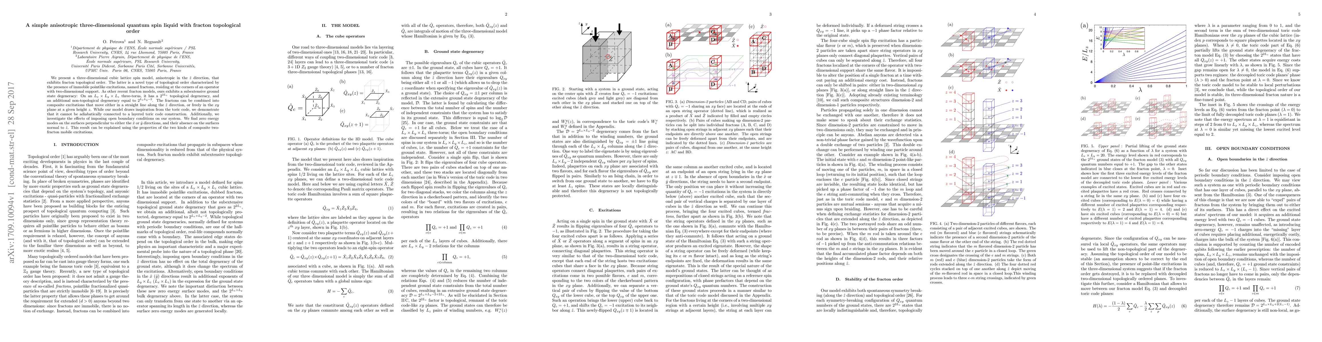We present a three-dimensional cubic lattice spin model, anisotropic in the $\hat{z}$ direction, that exhibits fracton topological order. The latter is a novel type of topological order characterized by the presence of immobile pointlike excitations, named fractons, residing at the corners of an operator with two-dimensional support. As other recent fracton models, ours exhibits a subextensive ground state degeneracy: On an $L_x\times L_y\times L_z$ three-torus, it has a $2^{2L_z}$ topological degeneracy, and an additional non-topological degeneracy equal to $2^{L_xL_y-2}$. The fractons can be combined into composite excitations that move either in a straight line along the $\hat{z}$ direction, or freely in the $xy$ plane at a given height $z$. While our model draws inspiration from the toric code, we demonstrate that it cannot be adiabatically connected to a layered toric code construction. Additionally, we investigate the effects of imposing open boundary conditions on our system. We find zero energy modes on the surfaces perpendicular to either the $\hat{x}$ or $\hat{y}$ directions, and their absence on the surfaces normal to $\hat{z}$. This result can be explained using the properties of the two kinds of composite two-fracton mobile excitations.