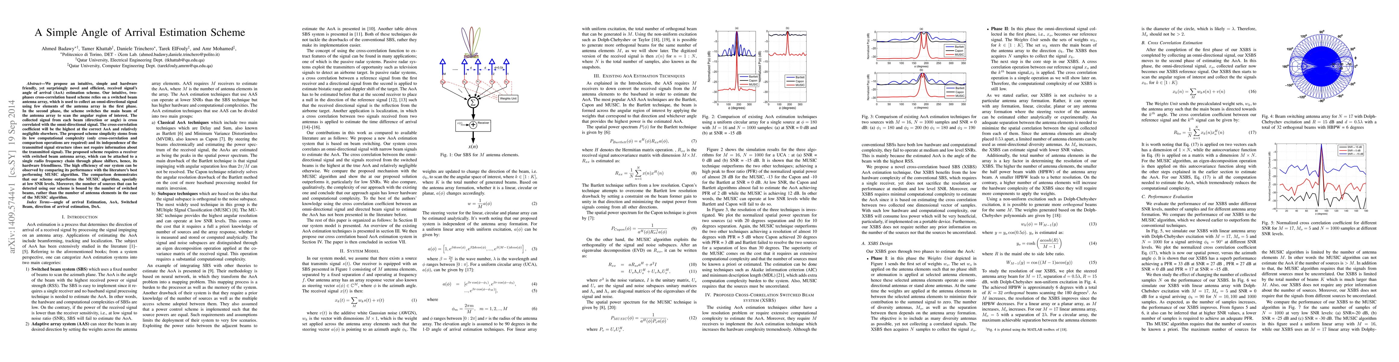 This paper proposes a simple, efficient angle of arrival (AoA) estimation scheme using a two-phase cross-correlation method with a switched beam antenna array. The scheme outperforms the MUSIC algorithm, especially at low SNR levels, due to its low computational complexity and hardware-friendly design.