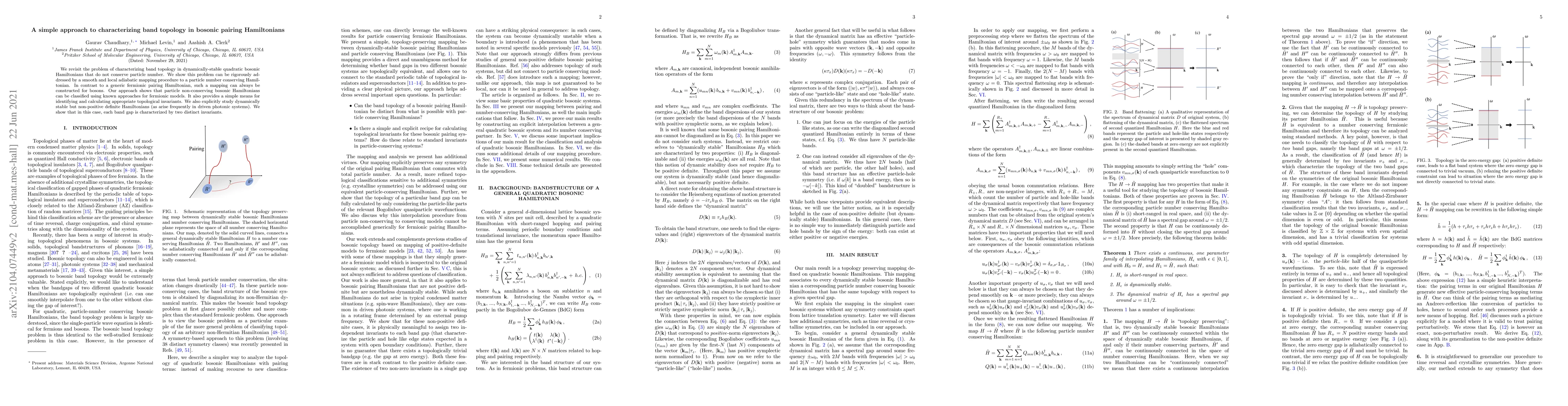 We revisit the problem of characterizing band topology in dynamically-stable quadratic bosonic Hamiltonians that do not conserve particle number. We show this problem can be rigorously addressed by a smooth and local adiabatic mapping procedure to a particle number conserving Hamiltonian. In contrast to a generic fermionic pairing Hamiltonian, such a mapping can always be constructed for bosons. Our approach shows that particle non-conserving bosonic Hamiltonians can be classified using known approaches for fermionic models. It also provides a simple means for identifying and calculating appropriate topological invariants. We also explicitly study dynamically stable but non-positive definite Hamiltonians (as arise frequently in driven photonic systems). We show that in this case, each band gap is characterized by two distinct invariants.