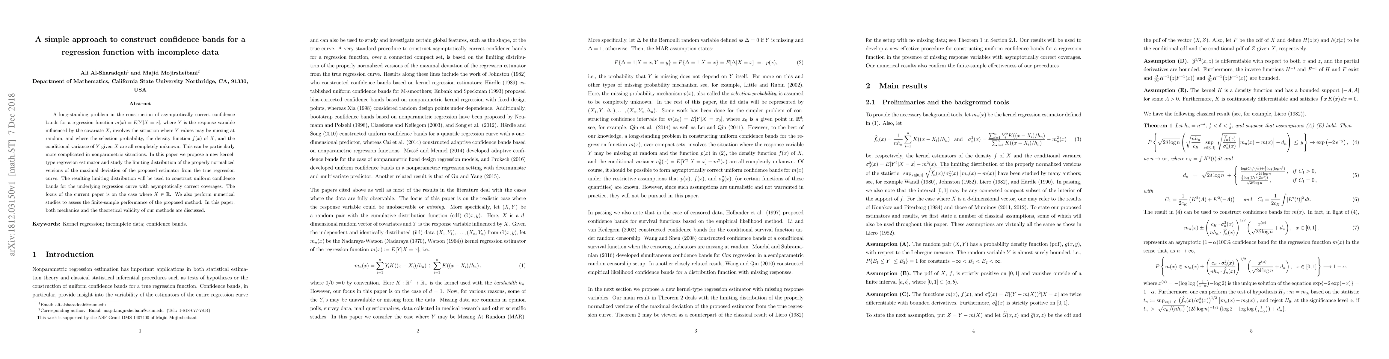 A long-standing problem in the construction of asymptotically correct confidence bands for a regression function $m(x)=E[Y|X=x]$, where $Y$ is the response variable influenced by the covariate $X$, involves the situation where $Y$ values may be missing at random, and where the selection probability, the density function $f(x)$ of $X$, and the conditional variance of $Y$ given $X$ are all completely unknown. This can be particularly more complicated in nonparametric situations. In this paper we propose a new kernel-type regression estimator and study the limiting distribution of the properly normalized versions of the maximal deviation of the proposed estimator from the true regression curve. The resulting limiting distribution will be used to construct uniform confidence bands for the underlying regression curve with asymptotically correct coverages. The focus of the current paper is on the case where $X\in \mathbb{R}$. We also perform numerical studies to assess the finite-sample performance of the proposed method. In this paper, both mechanics and the theoretical validity of our methods are discussed.