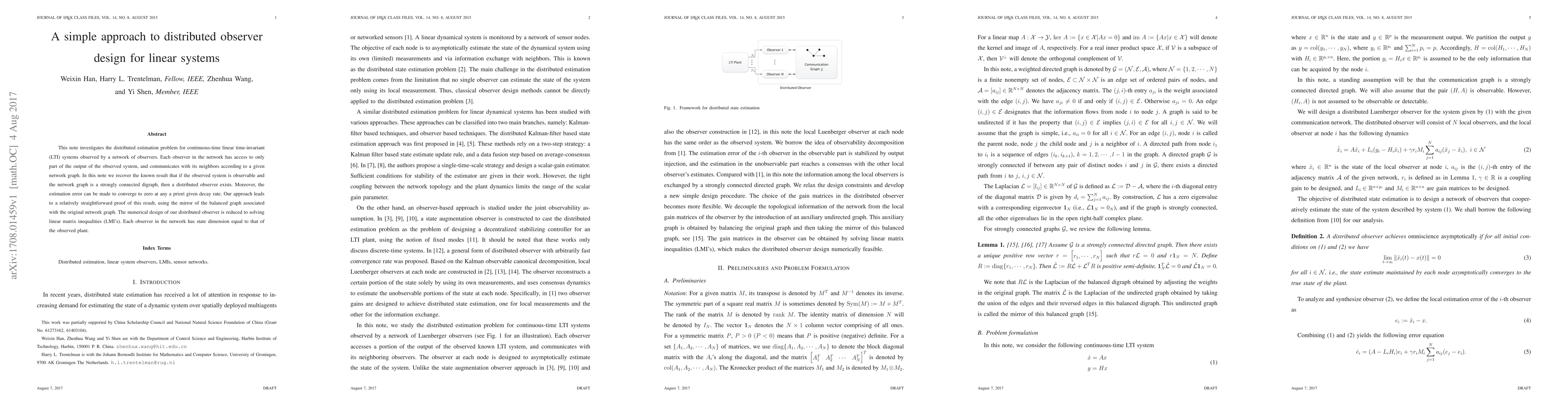 This note investigates the distributed estimation problem for continuous-time linear time-invariant (LTI) systems observed by a network of observers. Each observer in the network has access to only part of the output of the observed system, and communicates with its neighbors according to a given network graph. In this note we recover the known result that if the observed system is observable and the network graph is a strongly connected digraph, then a distributed observer exists. Moreover, the estimation error can be made to converge to zero at any a priori given decay rate. Our approach leads to a relatively straightforward proof of this result, using the mirror of the balanced graph associated with the original network graph. The numerical design of our distributed observer is reduced to solving linear matrix inequalities (LMI's). Each observer in the network has state dimension equal to that of the observed plant.