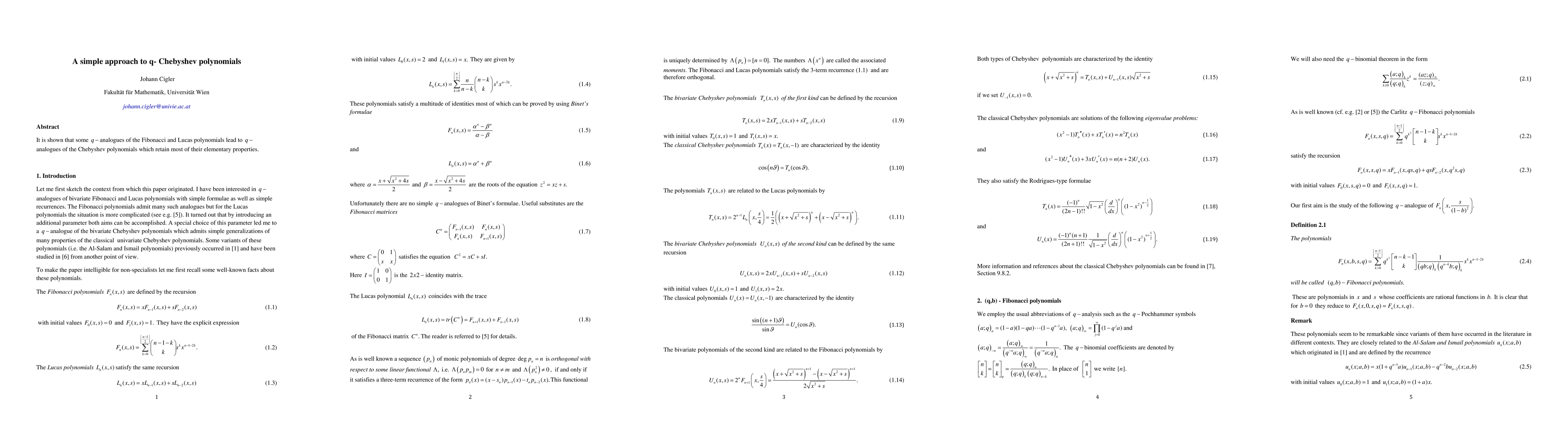 This paper demonstrates that q-analogues of Fibonacci and Lucas polynomials can generate q-Chebyshev polynomials, which largely preserve the elementary characteristics of traditional Chebyshev polynomials.