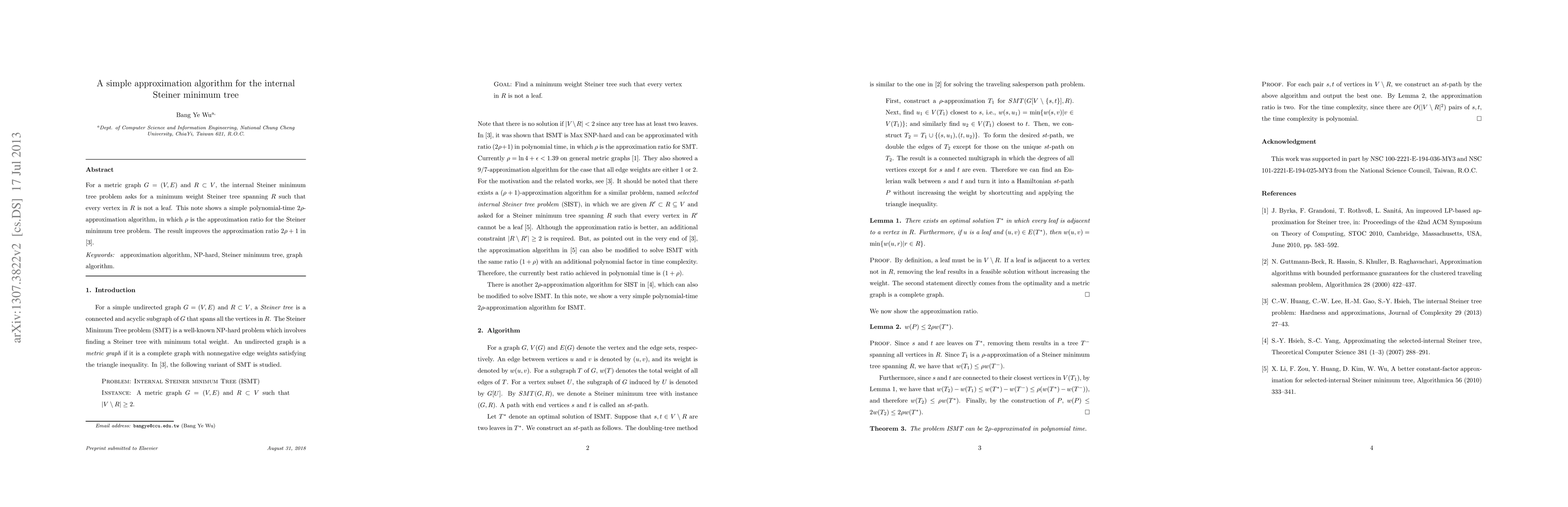 For a metric graph $G=(V,E)$ and $R\subset V$, the internal Steiner minimum tree problem asks for a minimum weight Steiner tree spanning $R$ such that every vertex in $R$ is not a leaf. This note shows a simple polynomial-time $2\rho$-approximation algorithm, in which $\rho$ is the approximation ratio for the Steiner minimum tree problem. The result improves the previous best approximation ratio $2\rho+1$ for the problem. The ratio is not currently best but the algorithm is very simple.
