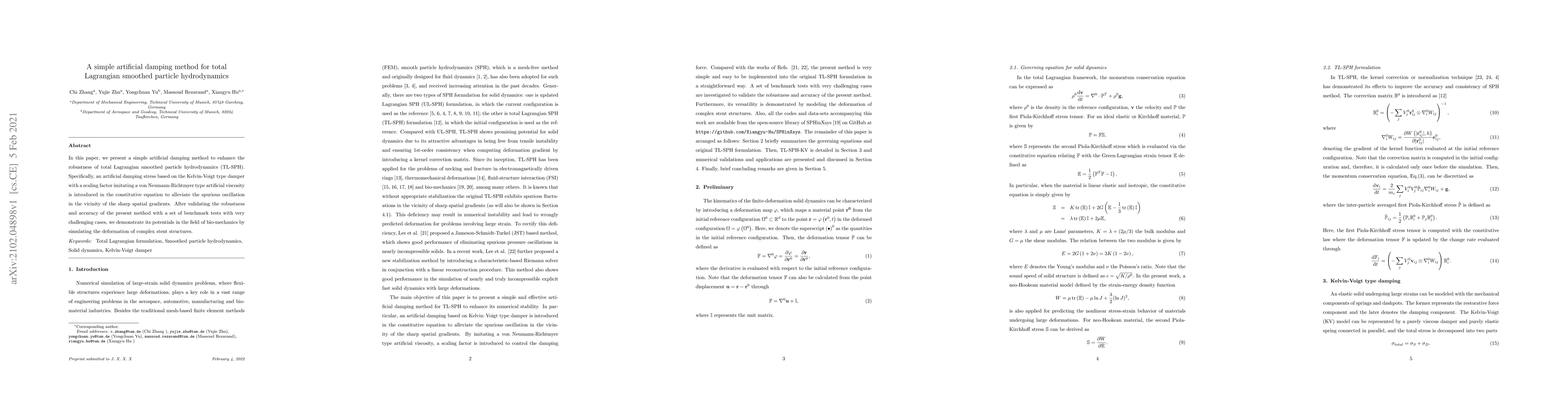 This paper introduces a simple artificial damping method to improve the robustness of total Lagrangian smoothed particle hydrodynamics (TL-SPH) by incorporating an artificial damping stress based on the Kelvin-Voigt model, which helps mitigate spurious oscillations near sharp gradients. The method is validated through benchmark tests and shown to effectively simulate the deformation of complex stent structures in biomechanics.