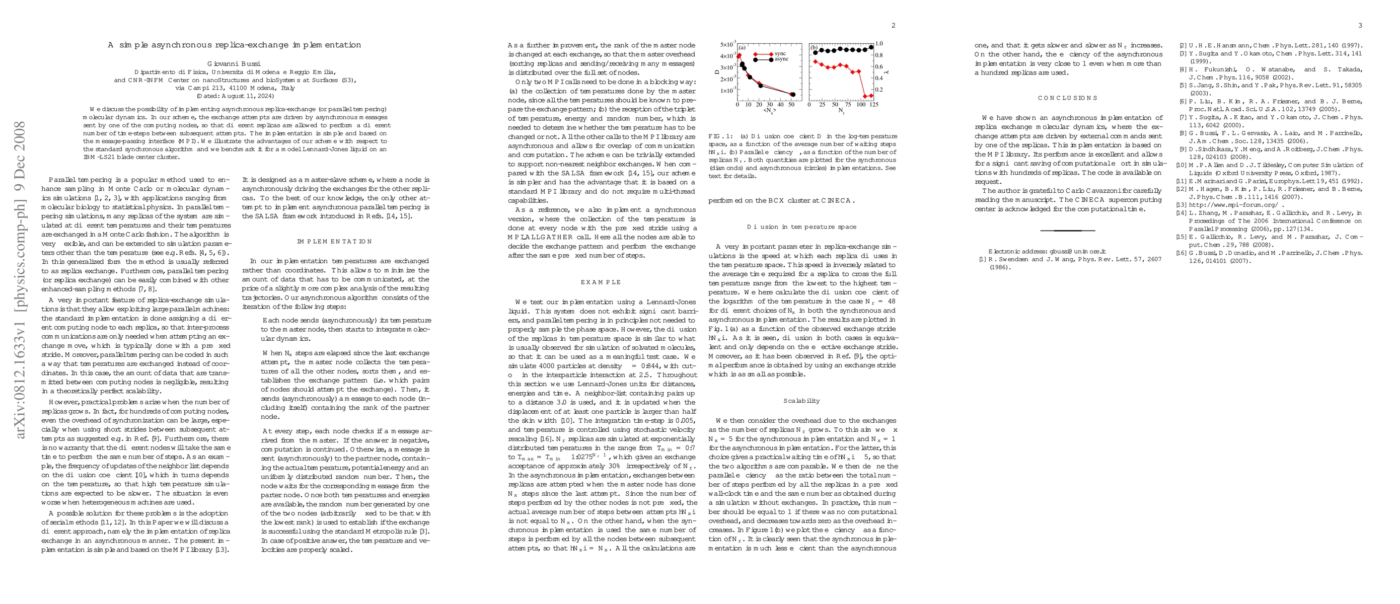 This paper presents a straightforward asynchronous replica-exchange molecular dynamics implementation using MPI, allowing different replicas to perform varying time-steps between exchange attempts. The proposed method is benchmarked against a standard synchronous algorithm and demonstrates efficiency on a Lennard-Jones liquid model.