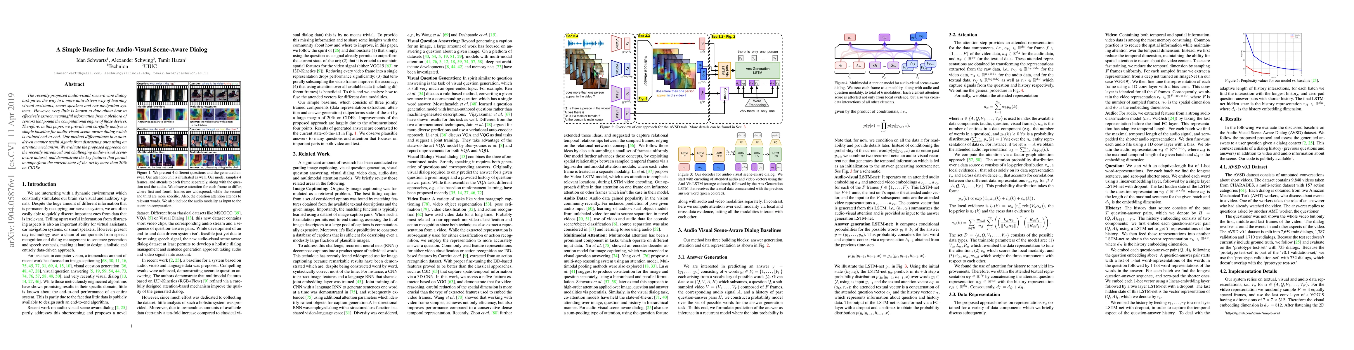This paper proposes a simple end-to-end baseline for audio-visual scene-aware dialog, utilizing an attention mechanism to filter meaningful information from various sensors. It outperforms current state-of-the-art methods by over 20% on CIDEr in evaluations on a challenging dataset.