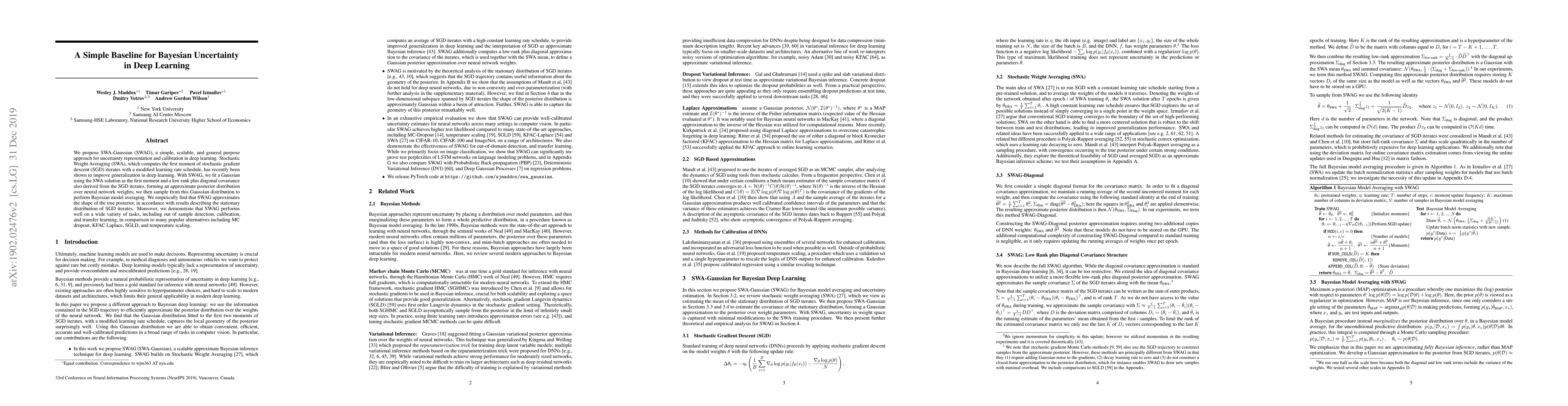 A new method called SWAG approximates a Bayesian posterior distribution for neural networks, performing well on various tasks like calibration and transfer learning. It outperforms other uncertainty estimation methods in deep learning.