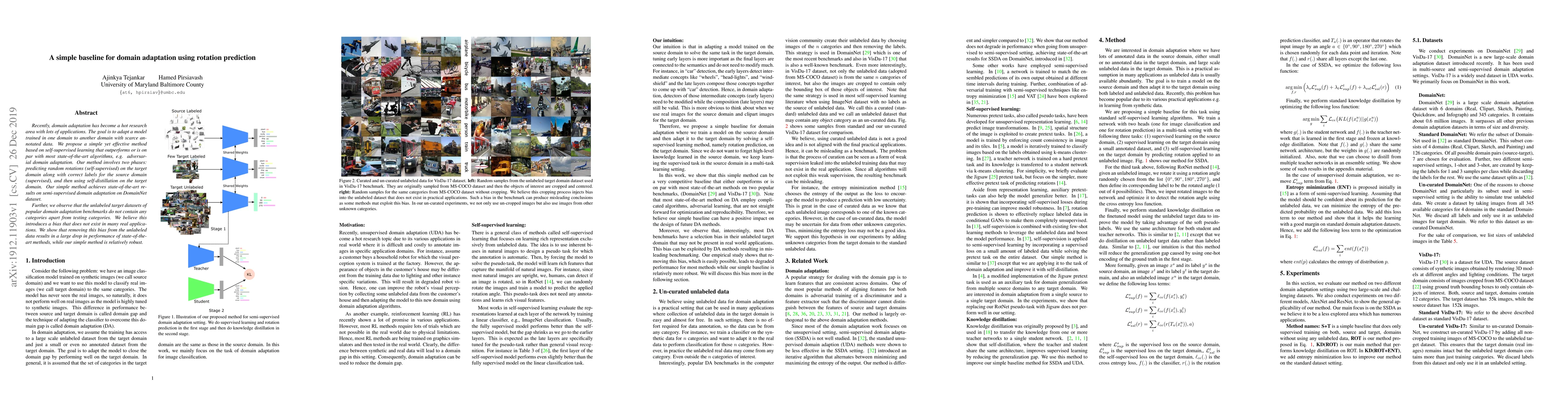 This paper proposes a simple self-supervised domain adaptation method using rotation prediction, achieving state-of-the-art results on the DomainNet dataset. The method involves predicting random rotations on the target domain and self-distillation, demonstrating robustness against biases in unlabeled target data.