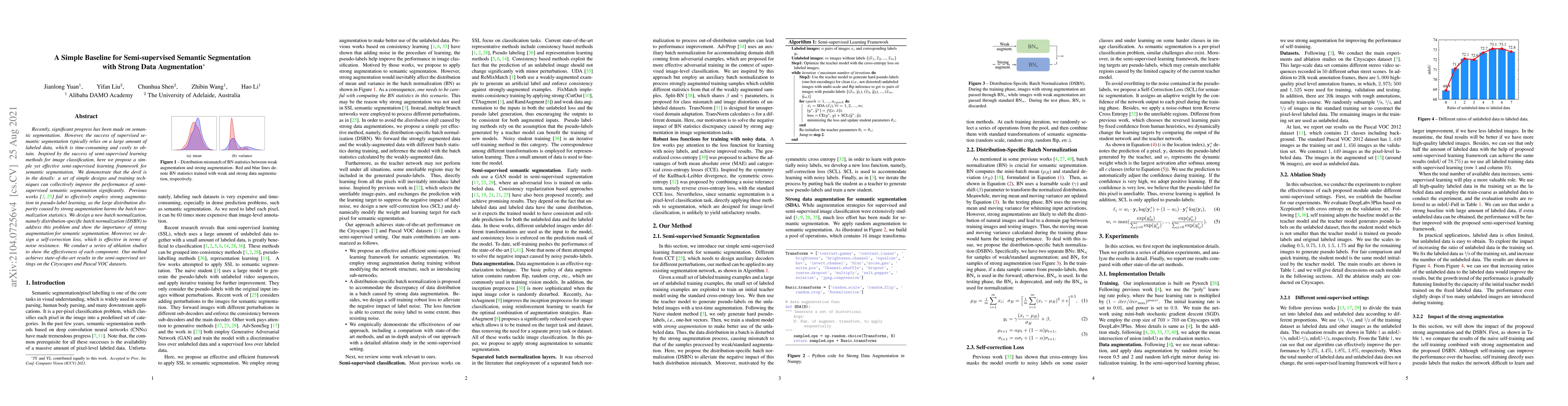 This paper proposes a simple semi-supervised learning framework for semantic segmentation that leverages strong data augmentation. It introduces distribution-specific batch normalization (DSBN) to mitigate issues caused by large distribution shifts and employs a self-correction loss for noise resistance, achieving state-of-the-art results on Cityscapes and Pascal VOC datasets.