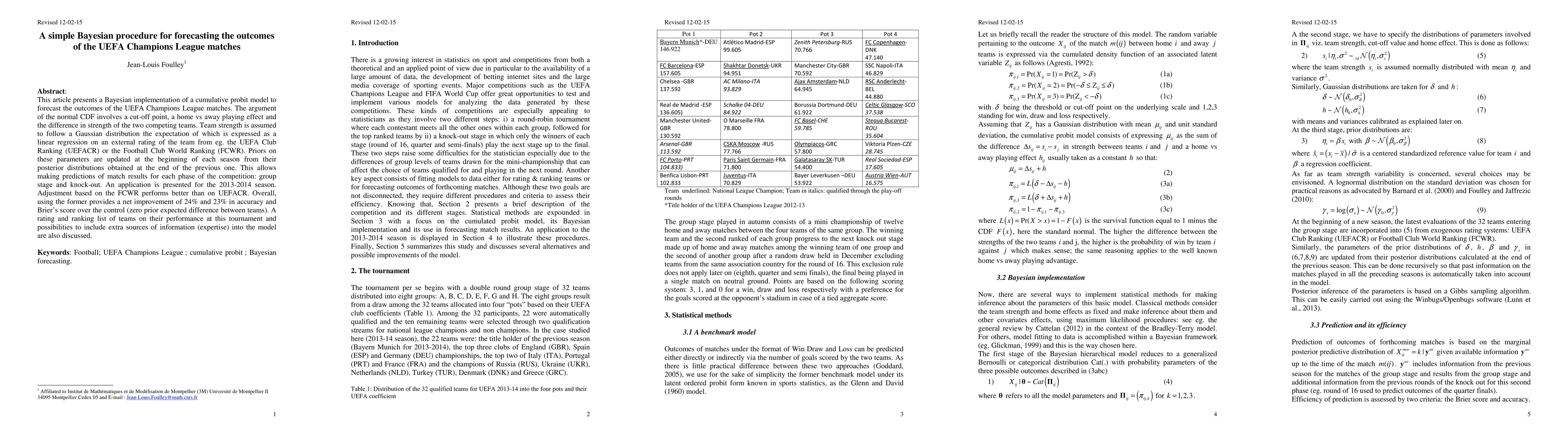 This paper proposes a Bayesian model to forecast UEFA Champions League match outcomes, using team strength and external ratings as predictors, and finds that adjusting with the FCWR performs better than UEFACR.