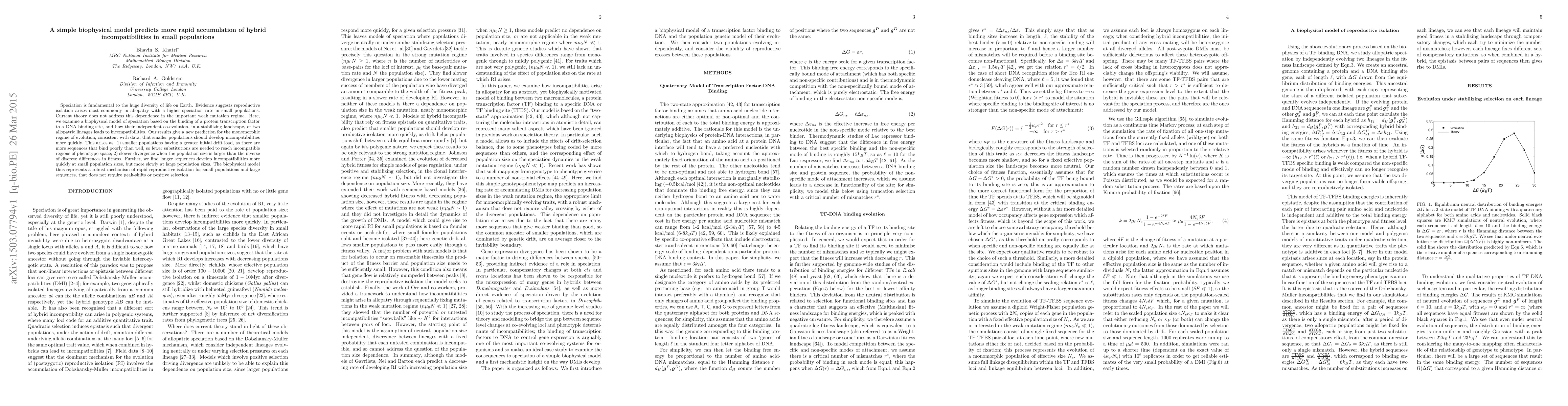 Speciation is fundamental to the huge diversity of life on Earth. Evidence suggests reproductive isolation arises most commonly in allopatry with a higher speciation rate in small populations. Current theory does not address this dependence in the important weak mutation regime. Here, we examine a biophysical model of speciation based on the binding of a protein transcription factor to a DNA binding site, and how their independent co-evolution, in a stabilizing landscape, of two allopatric lineages leads to incompatibilities. Our results give a new prediction for the monomorphic regime of evolution, consistent with data, that smaller populations should develop incompatibilities more quickly. This arises as: 1) smaller populations having a greater initial drift load, as there are more sequences that bind poorly than well, so fewer substitutions are needed to reach incompatible regions of phenotype space; 2) slower divergence when the population size is larger than the inverse of discrete differences in fitness. Further, we find longer sequences develop incompatibilities more quickly at small population sizes, but more slowly at large population sizes. The biophysical model thus represents a robust mechanism of rapid reproductive isolation for small populations and large sequences, that does not require peak-shifts or positive selection.