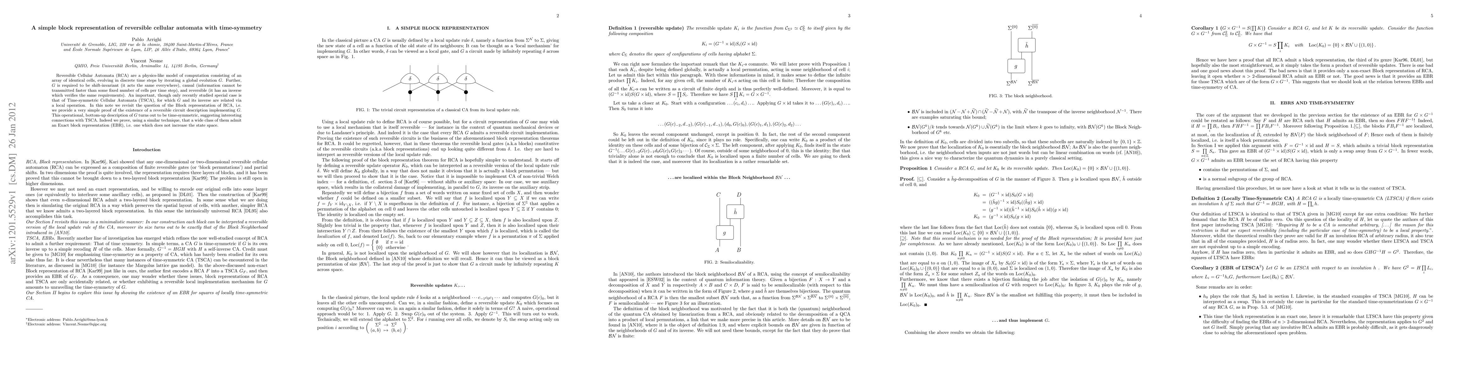 Reversible Cellular Automata (RCA) are a physics-like model of computation consisting of an array of identical cells, evolving in discrete time steps by iterating a global evolution G. Further, G is required to be shift-invariant (it acts the same everywhere), causal (information cannot be transmitted faster than some fixed number of cells per time step), and reversible (it has an inverse which verifies the same requirements). An important, though only recently studied special case is that of Time-symmetric Cellular Automata (TSCA), for which G and its inverse are related via a local operation. In this note we revisit the question of the Block representation of RCA, i.e. we provide a very simple proof of the existence of a reversible circuit description implementing G. This operational, bottom-up description of G turns out to be time-symmetric, suggesting interesting connections with TSCA. Indeed we prove, using a similar technique, that a wide class of them admit an Exact block representation (EBR), i.e. one which does not increase the state space.