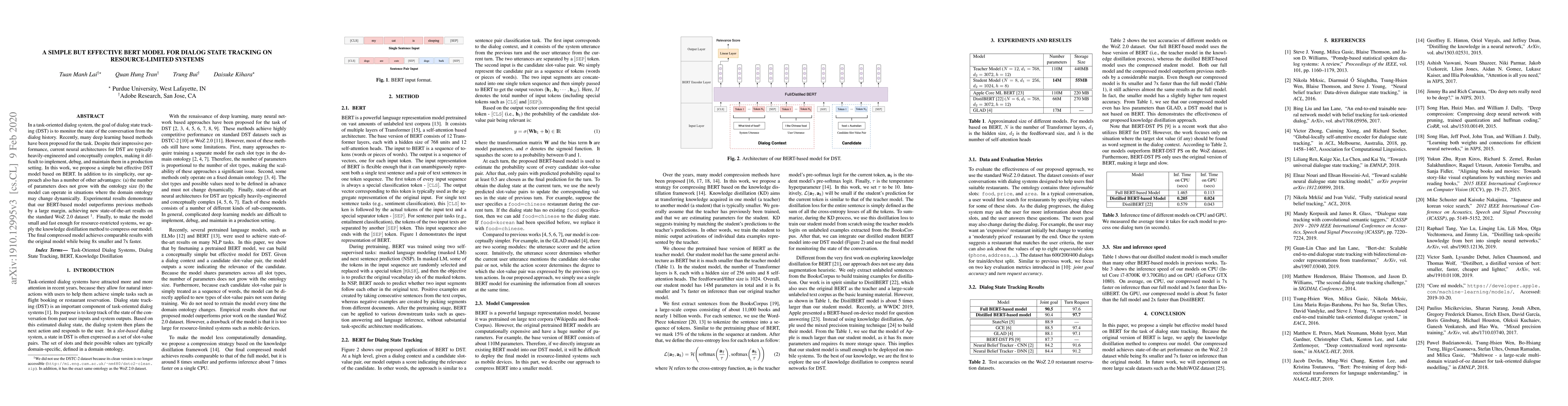In a task-oriented dialog system, the goal of dialog state tracking (DST) is to monitor the state of the conversation from the dialog history. Recently, many deep learning based methods have been proposed for the task. Despite their impressive performance, current neural architectures for DST are typically heavily-engineered and conceptually complex, making it difficult to implement, debug, and maintain them in a production setting. In this work, we propose a simple but effective DST model based on BERT. In addition to its simplicity, our approach also has a number of other advantages: (a) the number of parameters does not grow with the ontology size (b) the model can operate in situations where the domain ontology may change dynamically. Experimental results demonstrate that our BERT-based model outperforms previous methods by a large margin, achieving new state-of-the-art results on the standard WoZ 2.0 dataset. Finally, to make the model small and fast enough for resource-restricted systems, we apply the knowledge distillation method to compress our model. The final compressed model achieves comparable results with the original model while being 8x smaller and 7x faster.