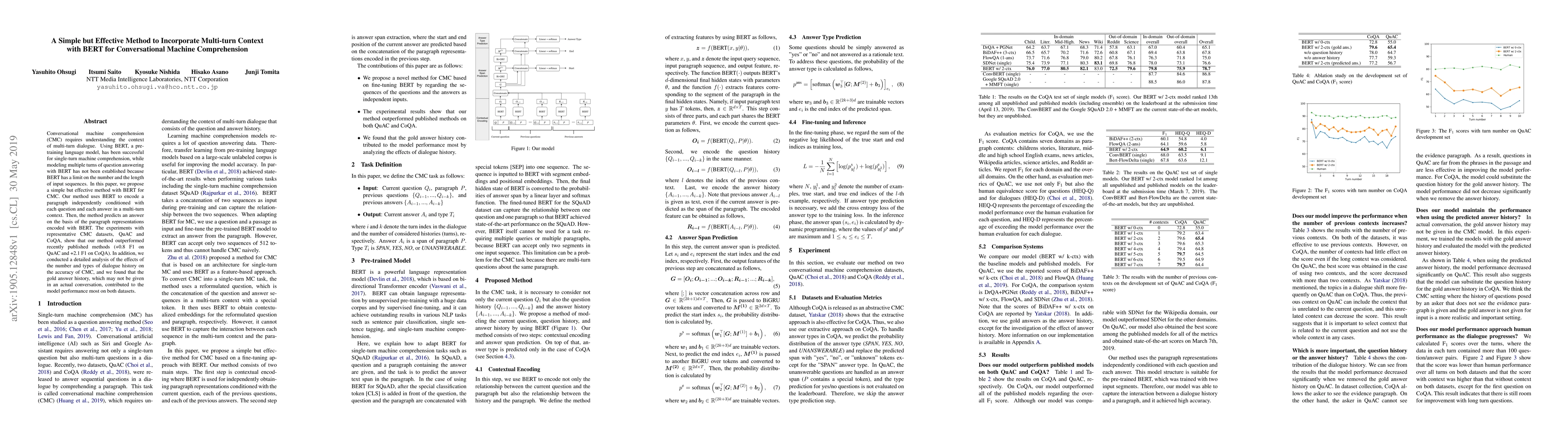 This paper introduces a method using BERT for conversational machine comprehension, encoding each question and answer in a multi-turn context independently. Experiments on QuAC and CoQA datasets show improved performance (+0.8 F1 on QuAC, +2.1 F1 on CoQA) compared to recent methods. Analysis reveals that gold answer history significantly boosts model accuracy, though it's not typically available in real conversations.