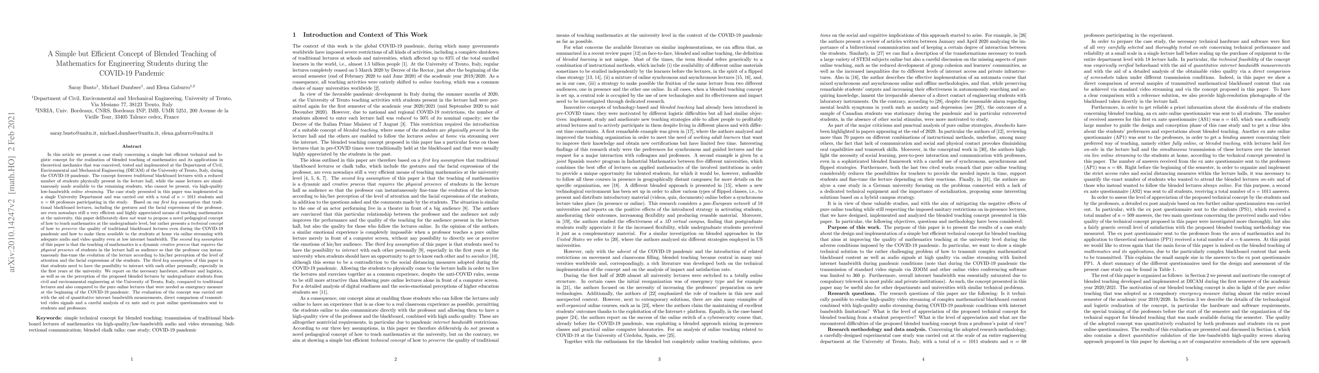 This paper introduces a blended teaching concept for mathematics and theoretical mechanics at the University of Trento, combining traditional blackboard lectures with online streaming to accommodate remote students during the COVID-19 pandemic. The approach maintains the quality of in-person lectures while ensuring remote students can access them, emphasizing the importance of physical presence for dynamic teaching and student interaction.