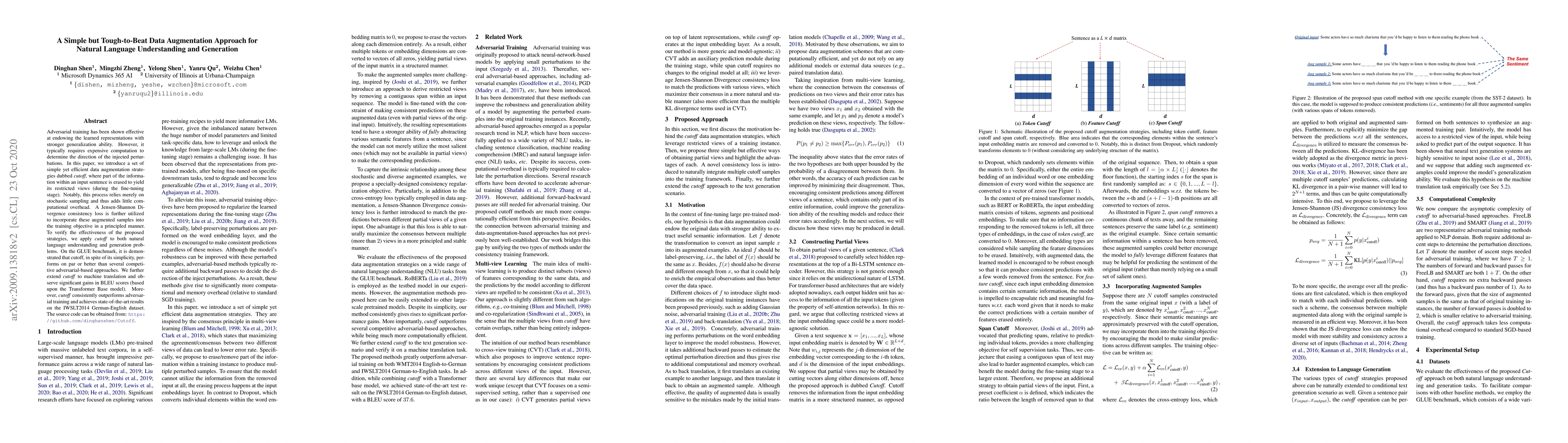 Adversarial training has been shown effective at endowing the learned representations with stronger generalization ability. However, it typically requires expensive computation to determine the direction of the injected perturbations. In this paper, we introduce a set of simple yet effective data augmentation strategies dubbed cutoff, where part of the information within an input sentence is erased to yield its restricted views (during the fine-tuning stage). Notably, this process relies merely on stochastic sampling and thus adds little computational overhead. A Jensen-Shannon Divergence consistency loss is further utilized to incorporate these augmented samples into the training objective in a principled manner. To verify the effectiveness of the proposed strategies, we apply cutoff to both natural language understanding and generation problems. On the GLUE benchmark, it is demonstrated that cutoff, in spite of its simplicity, performs on par or better than several competitive adversarial-based approaches. We further extend cutoff to machine translation and observe significant gains in BLEU scores (based upon the Transformer Base model). Moreover, cutoff consistently outperforms adversarial training and achieves state-of-the-art results on the IWSLT2014 German-English dataset.
