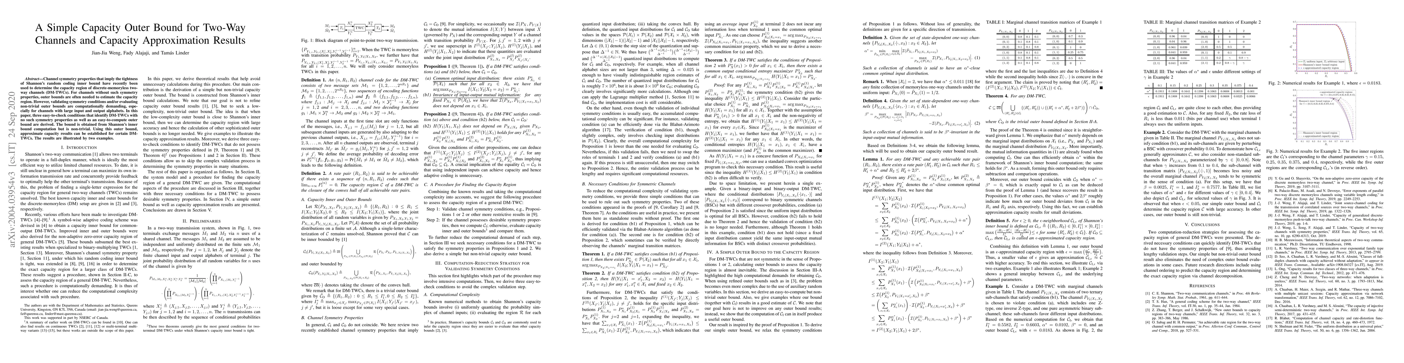 Channel symmetry properties that imply the tightness of Shannon's random coding inner bound have recently been used to determine the capacity region of discrete-memoryless two-way channels (DM-TWCs). For channels without such symmetry properties, outer bounds are often needed to estimate the capacity region. However, validating symmetry conditions and/or evaluating non-trivial outer bounds are computationally demanding, especially for channels with large input and output alphabets. In this paper, three easy-to-check conditions that identify DM-TWCs with no such symmetry properties as well as an easy-to-compute outer bound are derived. The bound is obtained from Shannon's inner bound computation but is non-trivial. Using this outer bound, approximate capacity results can be established for certain DM-TWCs. The results are illustrated by two examples.