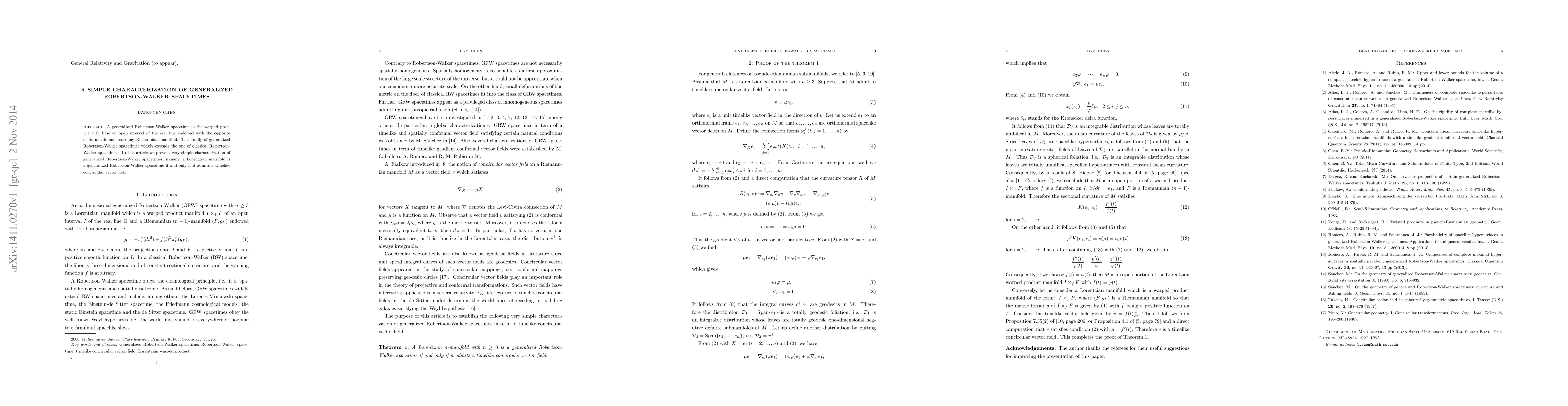 This paper characterizes generalized Robertson-Walker spacetimes as Lorentzian manifolds admitting a timelike concircular vector field. The characterization extends beyond classical Robertson-Walker spacetimes.