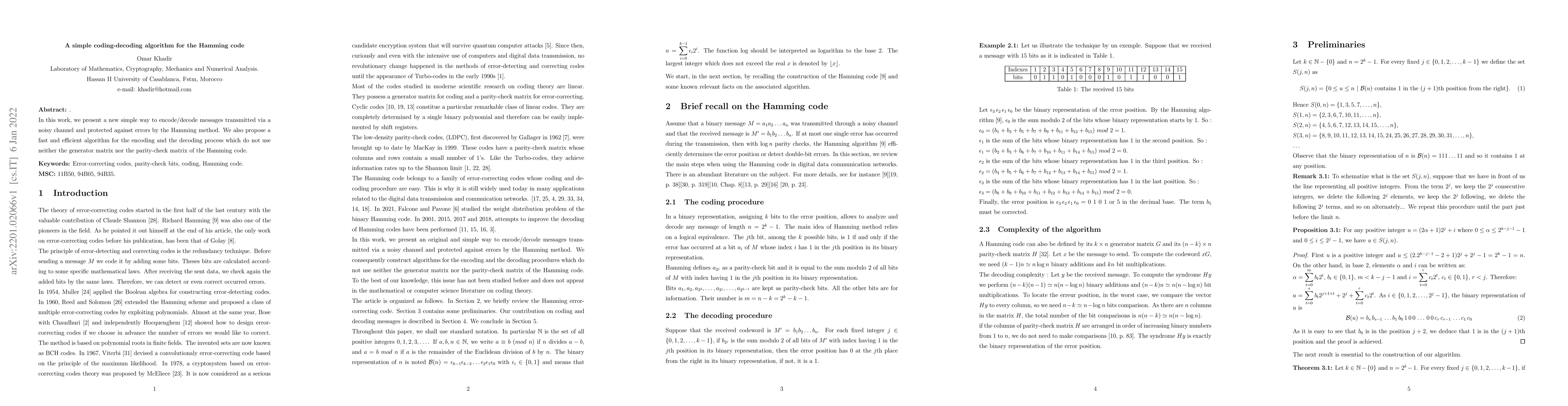 This paper introduces a straightforward coding-decoding algorithm for Hamming codes, bypassing the traditional use of generator and parity-check matrices, aiming for faster and more efficient error correction in message transmission over noisy channels.