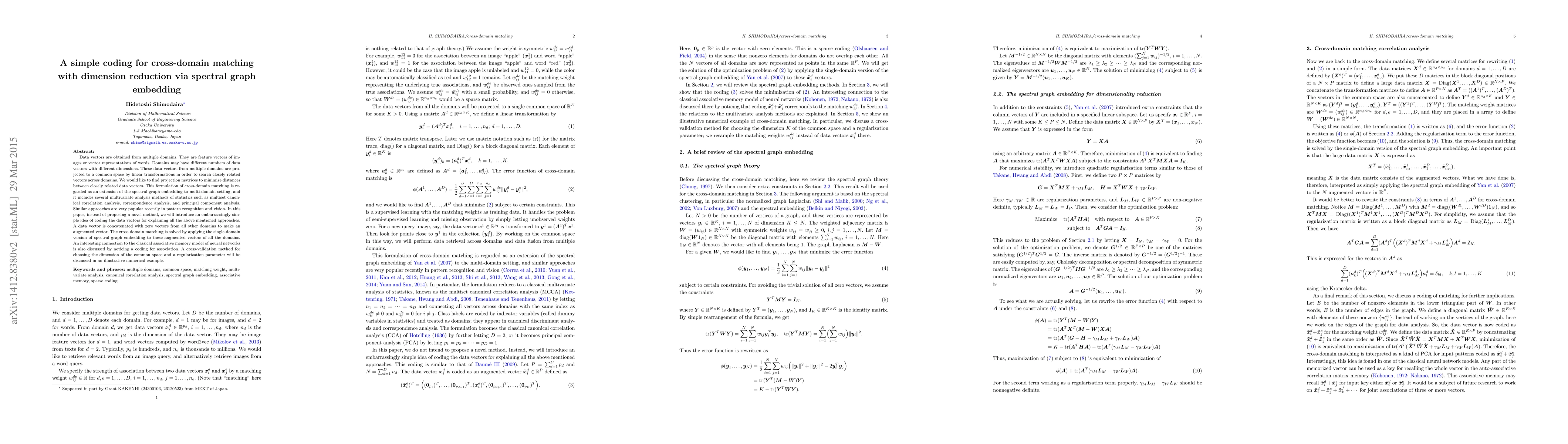 Data vectors are obtained from multiple domains. They are feature vectors of images or vector representations of words. Domains may have different numbers of data vectors with different dimensions. These data vectors from multiple domains are projected to a common space by linear transformations in order to search closely related vectors across domains. We would like to find projection matrices to minimize distances between closely related data vectors. This formulation of cross-domain matching is regarded as an extension of the spectral graph embedding to multi-domain setting, and it includes several multivariate analysis methods of statistics such as multiset canonical correlation analysis, correspondence analysis, and principal component analysis. Similar approaches are very popular recently in pattern recognition and vision. In this paper, instead of proposing a novel method, we will introduce an embarrassingly simple idea of coding the data vectors for explaining all the above mentioned approaches. A data vector is concatenated with zero vectors from all other domains to make an augmented vector. The cross-domain matching is solved by applying the single-domain version of spectral graph embedding to these augmented vectors of all the domains. An interesting connection to the classical associative memory model of neural networks is also discussed by noticing a coding for association. A cross-validation method for choosing the dimension of the common space and a regularization parameter will be discussed in an illustrative numerical example.
