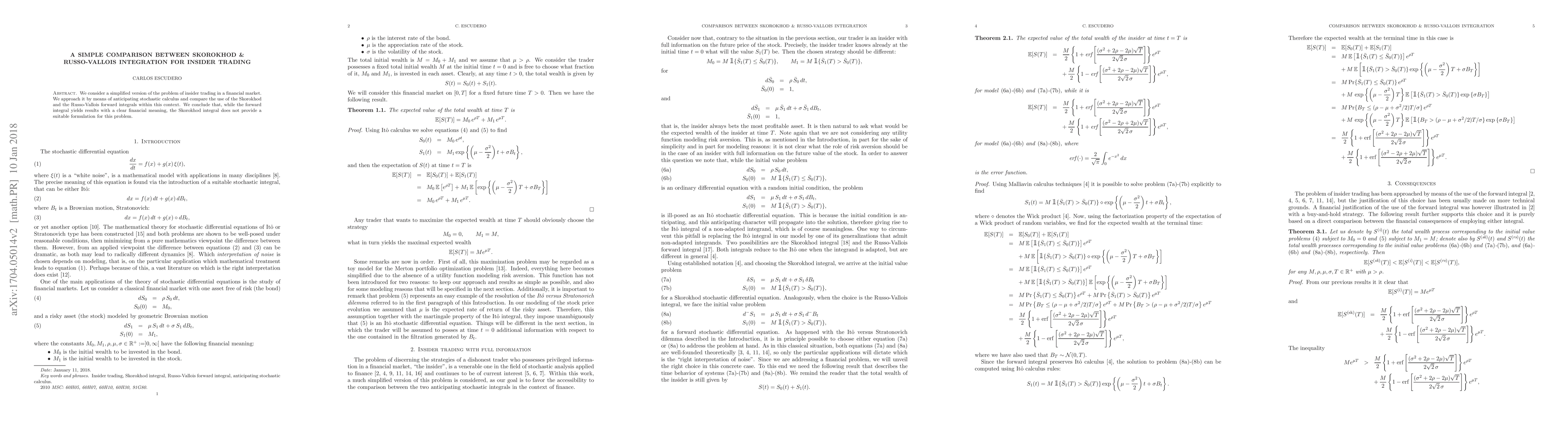 Summary: This paper compares Skorokhod and Russo-Vallois integration in the context of insider trading using anticipating stochastic calculus. It concludes that Russo-Vallois integration offers clearer financial interpretations, while Skorokhod integration is unsuitable for this problem.