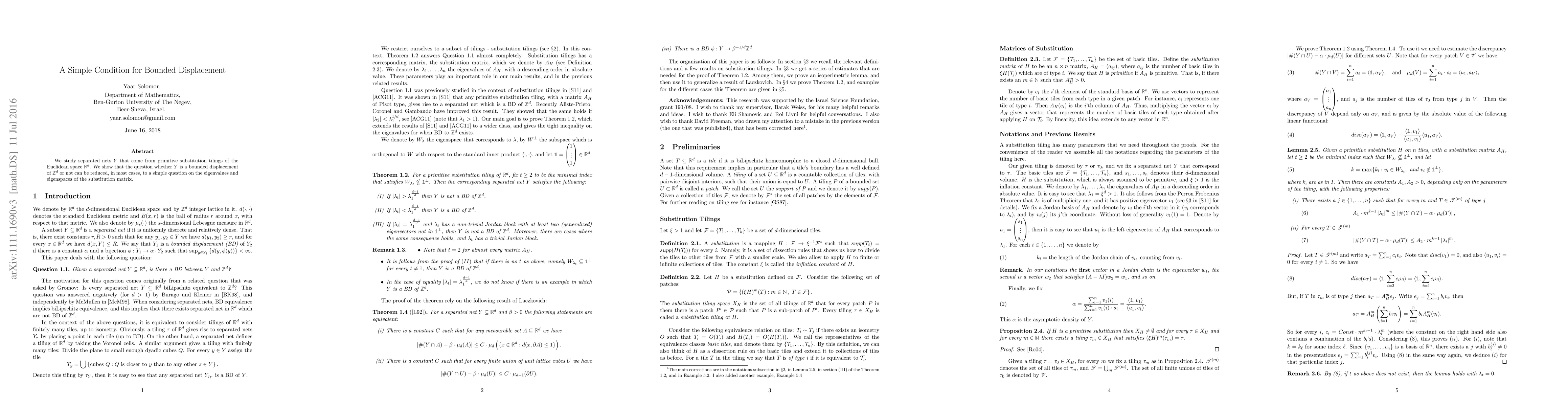 We study separated nets that correspond to substitution tilings of the Euclidean space. We give a simple condition, in terms of the eigenvalues and eigenspaces of the substitution matrix, to know whether the separated net is a bounded displacement of the integer lattice or not.