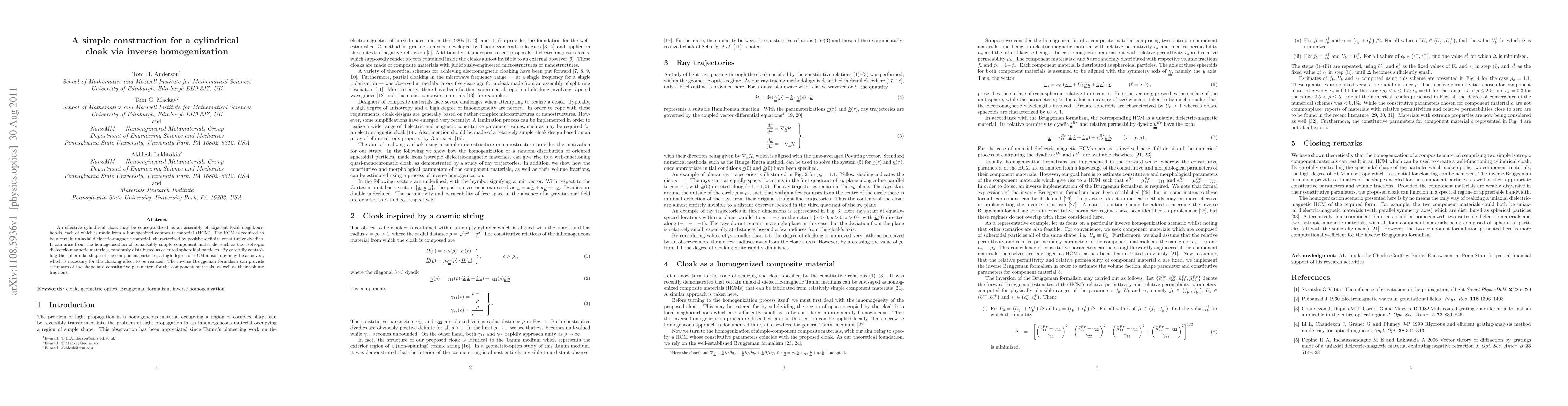 An effective cylindrical cloak may be conceptualized as an assembly of adjacent local neighbourhoods, each of which is made from a homogenized composite material (HCM). The HCM is required to be a certain uniaxial dielectric-magnetic material, characterized by positive-definite constitutive dyadics. It can arise from the homogenization of remarkably simple component materials, such as two isotropic dielectric-magnetic materials, randomly distributed as oriented spheroidal particles. By carefully controlling the spheroidal shape of the component particles, a high degree of HCM anisotropy may be achieved, which is necessary for the cloaking effect to be realized. The inverse Bruggeman formalism can provide estimates of the shape and constitutive parameters for the component materials, as well as their volume fractions.