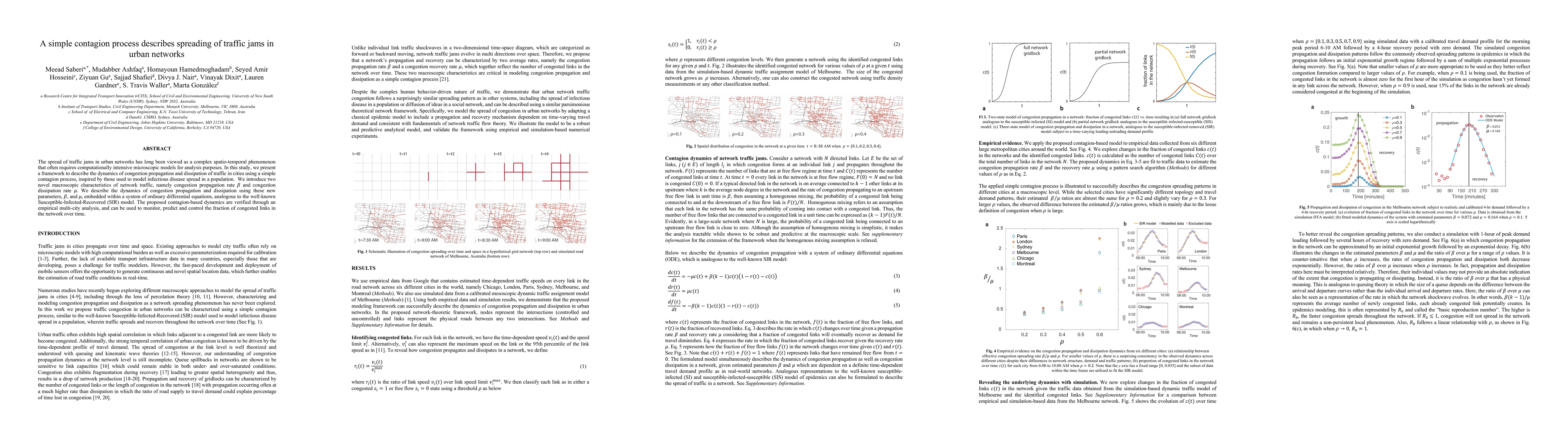 The spread of traffic jams in urban networks has long been viewed as a complex spatio-temporal phenomenon that often requires computationally intensive microscopic models for analysis purposes. In this study, we present a framework to describe the dynamics of congestion propagation and dissipation of traffic in cities using a simple contagion process, inspired by those used to model infectious disease spread in a population. We introduce two novel macroscopic characteristics of network traffic, namely congestion propagation rate \b{eta} and congestion dissipation rate {\mu}. We describe the dynamics of congestion propagation and dissipation using these new parameters, \b{eta}, and {\mu}, embedded within a system of ordinary differential equations, analogous to the well-known Susceptible-Infected-Recovered (SIR) model. The proposed contagion-based dynamics are verified through an empirical multi-city analysis, and can be used to monitor, predict and control the fraction of congested links in the network over time.