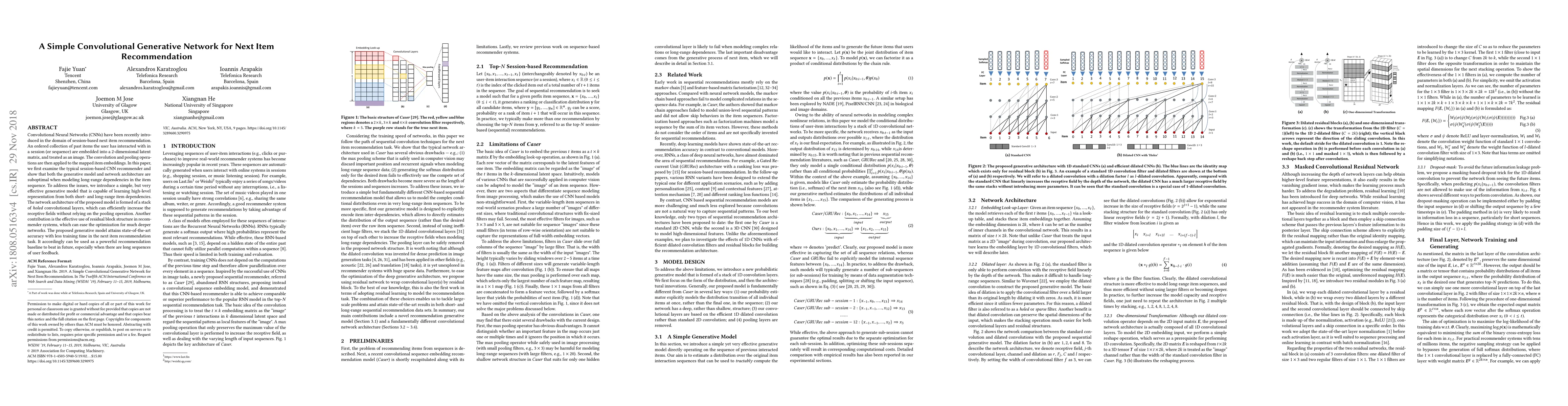 This paper proposes a simple convolutional generative network for next item recommendation, demonstrating that it outperforms existing models by effectively learning from both short- and long-range item dependencies through stacked holed convolutional layers and residual block structures, achieving state-of-the-art accuracy with reduced training time.