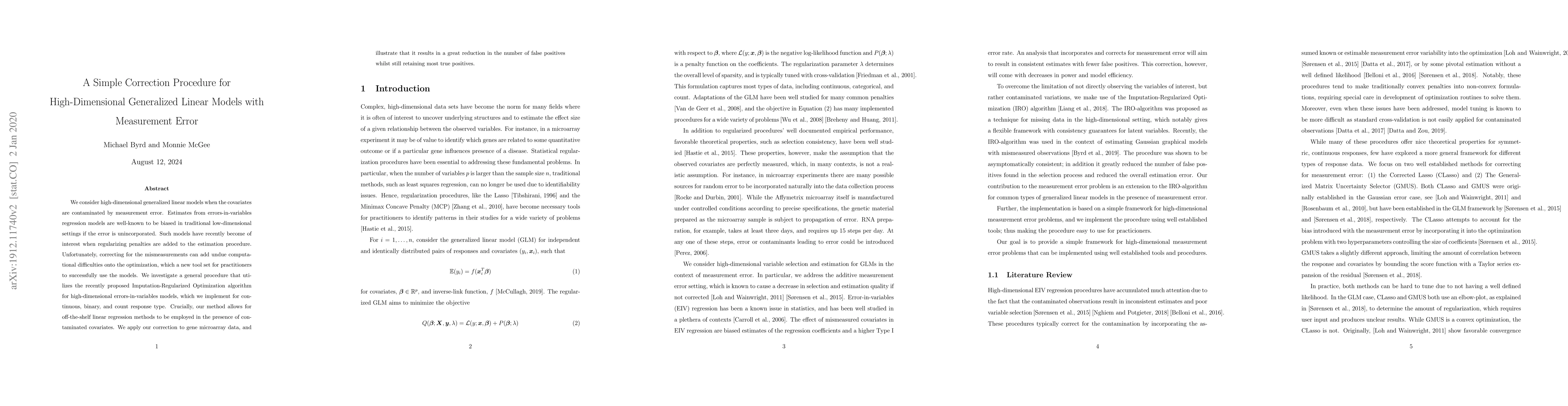 This paper proposes a correction procedure for high-dimensional generalized linear models with measurement error, utilizing the Imputation-Regularized Optimization algorithm. The method allows for the use of standard linear regression techniques and demonstrates improved performance in gene microarray data analysis.