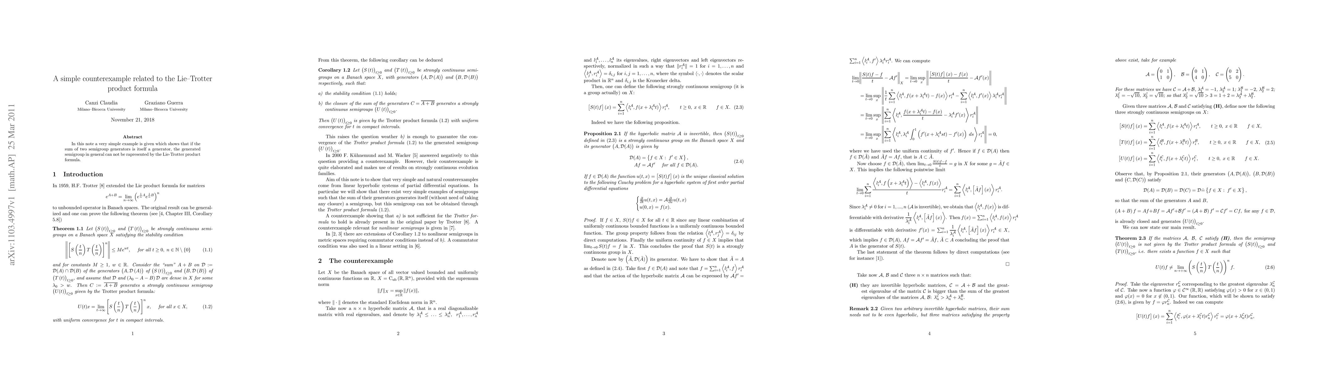Summary: This paper presents a straightforward counterexample demonstrating that even if the sum of two semigroup generators is itself a generator, the associated semigroup cannot always be represented using the Lie-Trotter product formula. The example highlights limitations in the applicability of the Lie-Trotter formula.