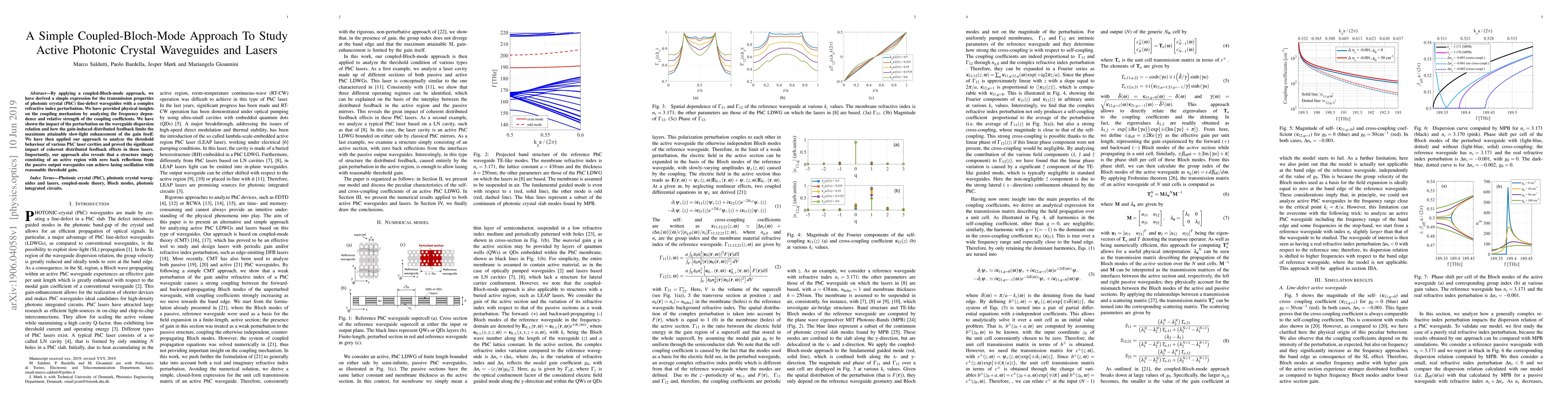 This paper employs a coupled-Bloch-mode approach to study the transmission properties of photonic crystal waveguides and lasers, revealing the impact of refractive index perturbations on waveguide dispersion and gain-induced feedback effects. The analysis shows that lasing can occur in structures with zero back reflections, highlighting the role of coherent distributed feedback.