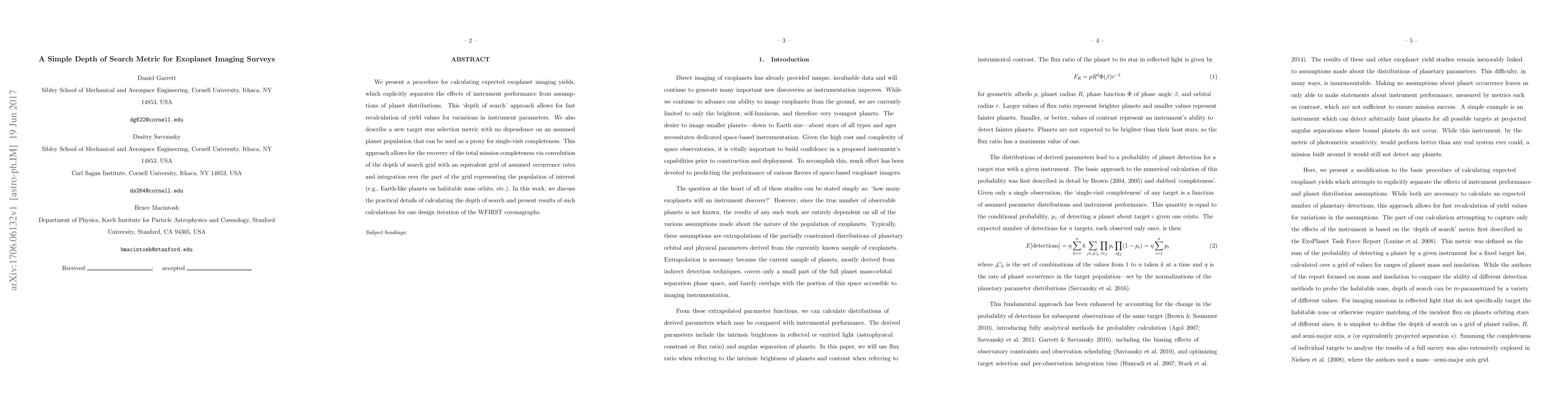 We present a procedure for calculating expected exoplanet imaging yields, which explicitly separates the effects of instrument performance from assumptions of planet distributions. This `depth of search' approach allows for fast recalculation of yield values for variations in instrument parameters. We also describe a new target star selection metric with no dependence on an assumed planet population that can be used as a proxy for single-visit completeness. This approach allows for the recovery of the total mission completeness via convolution of the depth of search grid with an equivalent grid of assumed occurrence rates and integration over the part of the grid representing the population of interest (e.g., Earth-like planets on habitable zone orbits, etc.). In this work, we discuss the practical details of calculating the depth of search and present results of such calculations for one design iteration of the WFIRST coronagraphs.