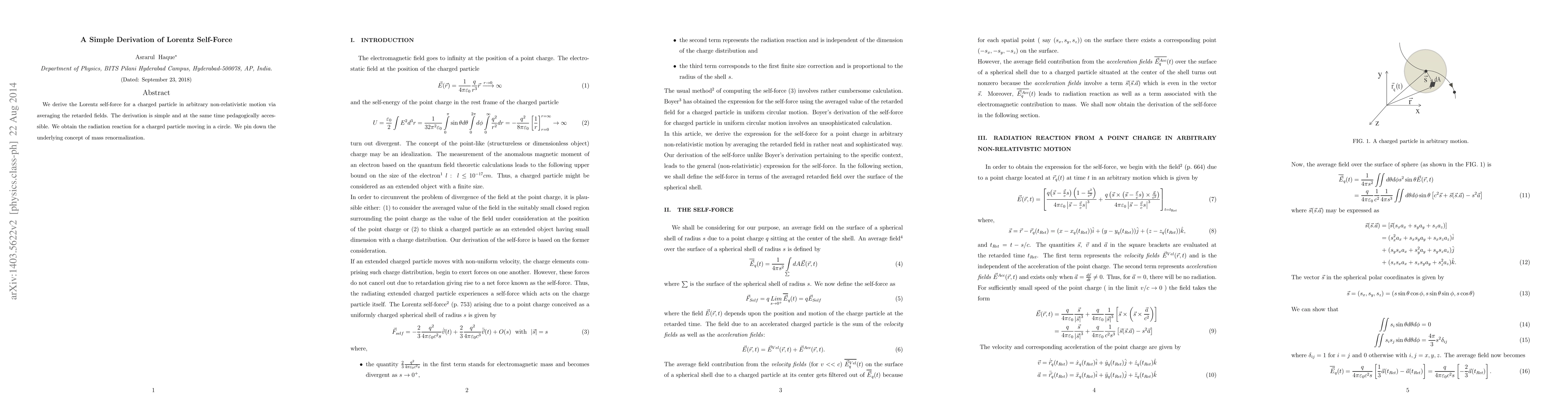 We derive the Lorentz self force for an arbitrarily moving charged particle via averaging the retarded fields. The derivation is simple and at the same time pedagogically accessible. We obtain the radiation reaction for a charged particle moving in a conic. We pin down the underlying concept of mass renormalization.