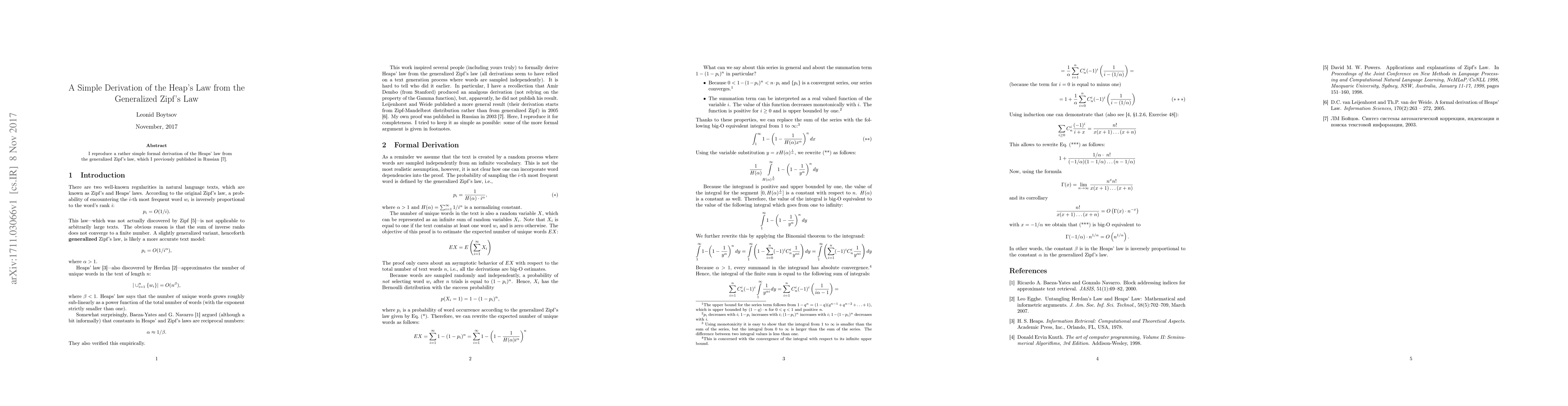 I reproduce a rather simple formal derivation of the Heaps' law from the generalized Zipf's law, which I previously published in Russian.