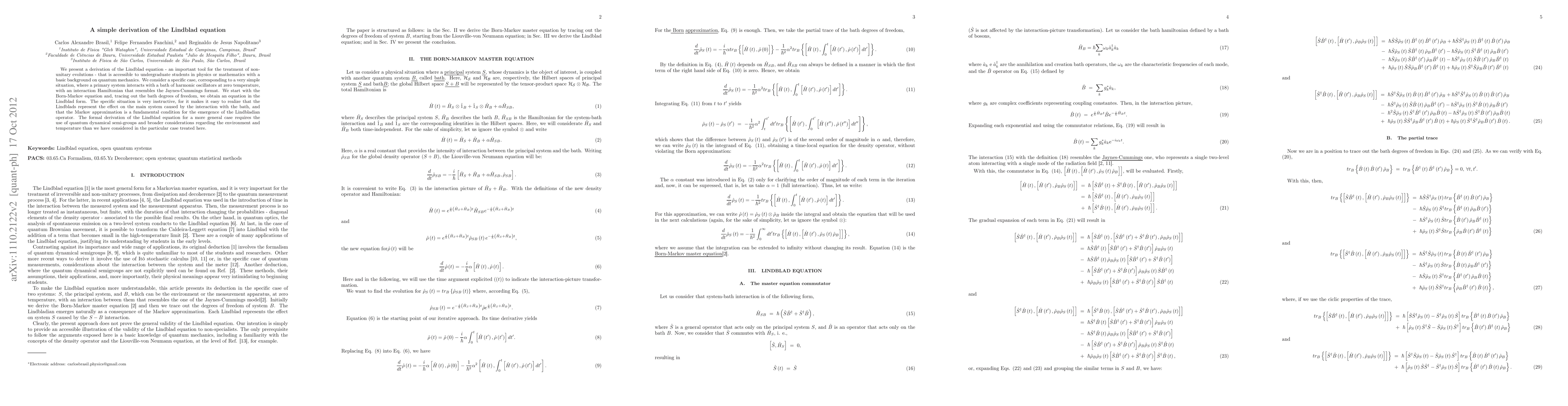 Researchers derived a simple Lindblad equation for non-unitary evolutions in quantum mechanics, using the Born-Markov equation to model interaction between a system and a bath of harmonic oscillators.