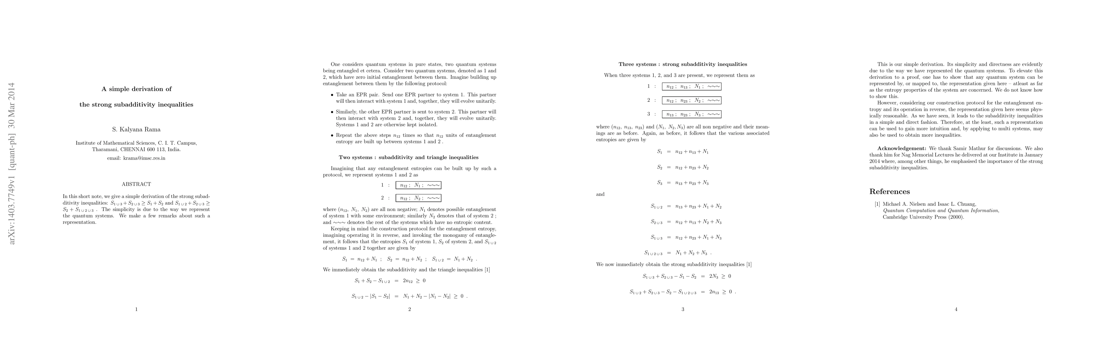 In this short note, we give a simple derivation of the strong subadditivity inequalities: S(13) + S(23) \ge S(1) + S(2) and S(12) + S(23) \ge S(2) + S(123). The simplicity is due to the way we represent the quantum systems. We make a few remarks about such a representation.