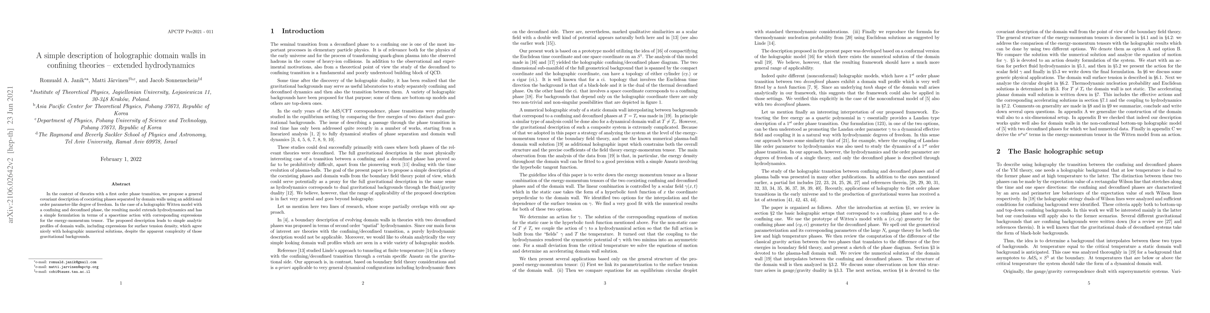 The paper proposes a covariant description of coexisting phases separated by domain walls in theories with first order phase transitions, using an additional order parameter-like degree of freedom. This model, applied to a holographic Witten model, extends hydrodynamics and provides simple analytic profiles for domain walls, agreeing with holographic numerical solutions.