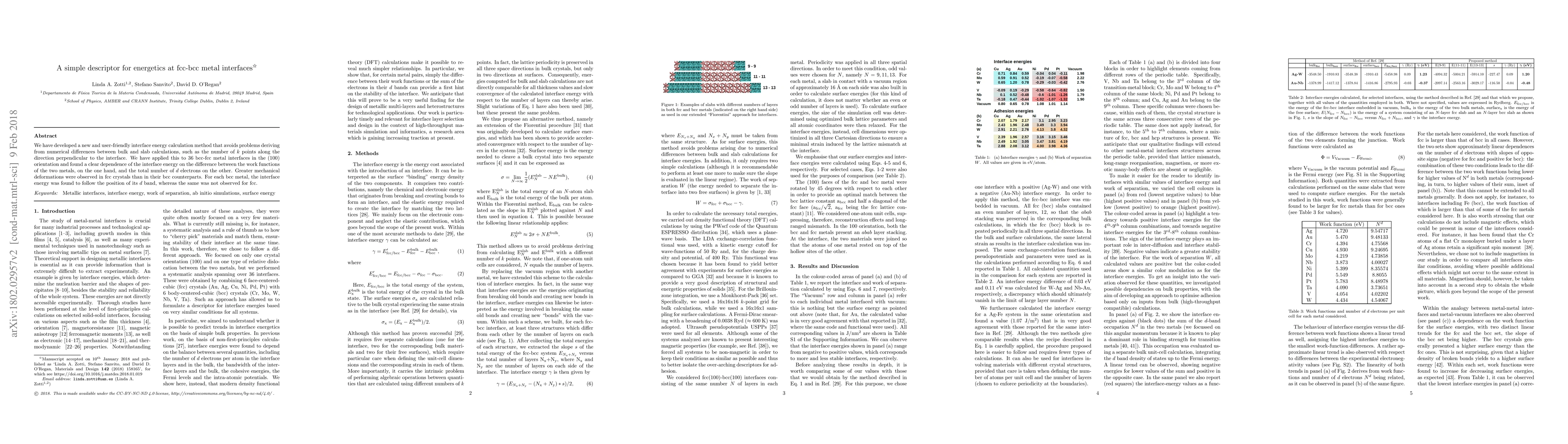 Researchers developed a new method to calculate interface energy between fcc-bcc metal interfaces, finding that it depends on the difference in work functions and d electron count, with greater deformations observed in fcc crystals.